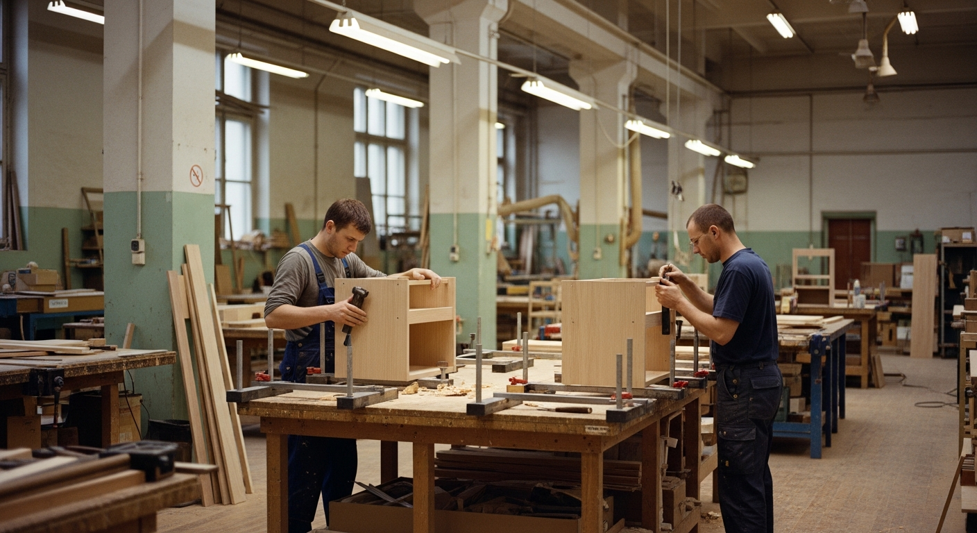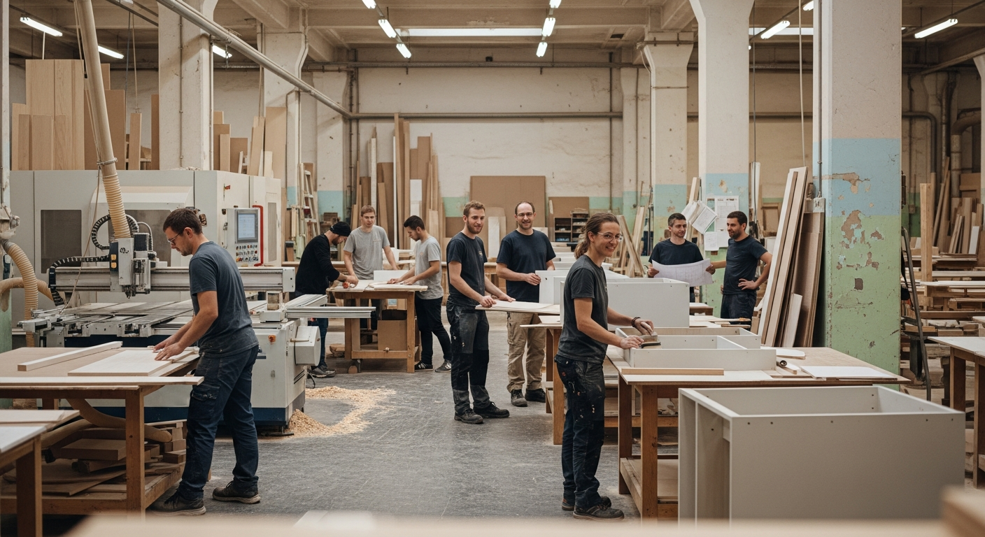 Дальше идёт распил деталей, кромление, покраска или лакировка фасадов (если это МДФ/эмаль), подготовка и комплектация фурнитуры.