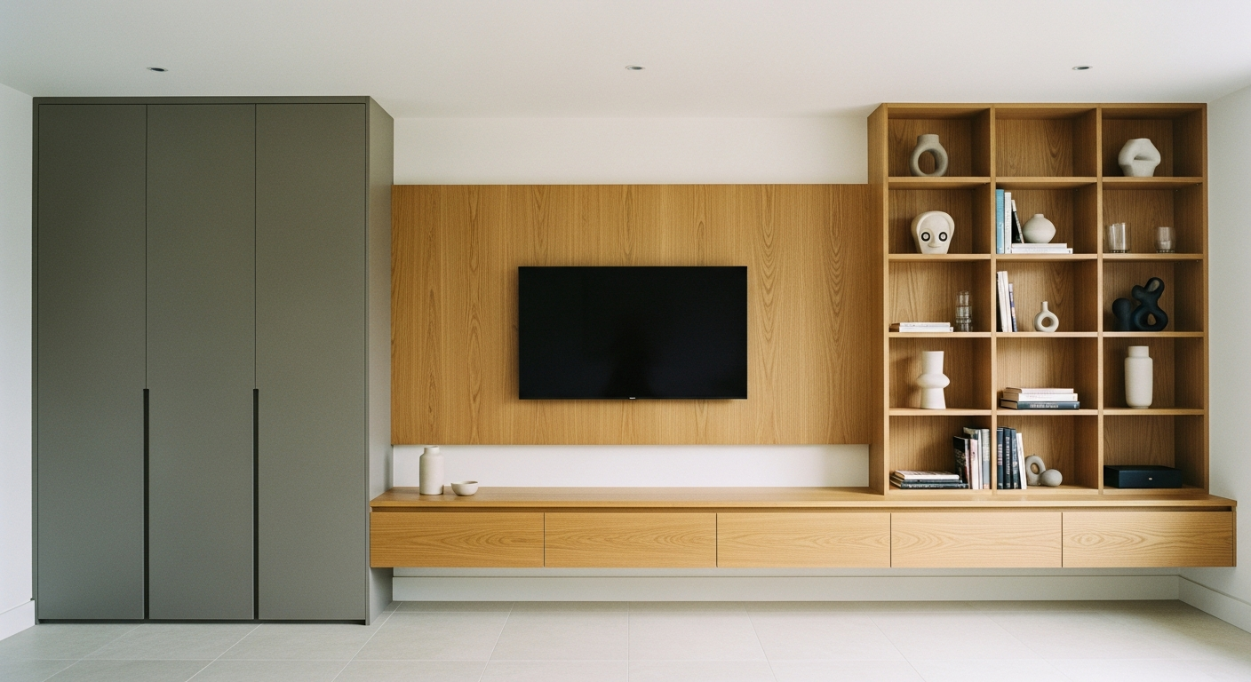 Продумываем внутреннюю структуру, распределяем полки и ящики так, чтобы всё хранилось аккуратно, а фасады создавали чистый визуальный объём без лишних деталей. Такой подход делает комнату более спокойной и упорядоченной, сохраняя гармонию в интерьере и удобство использования.