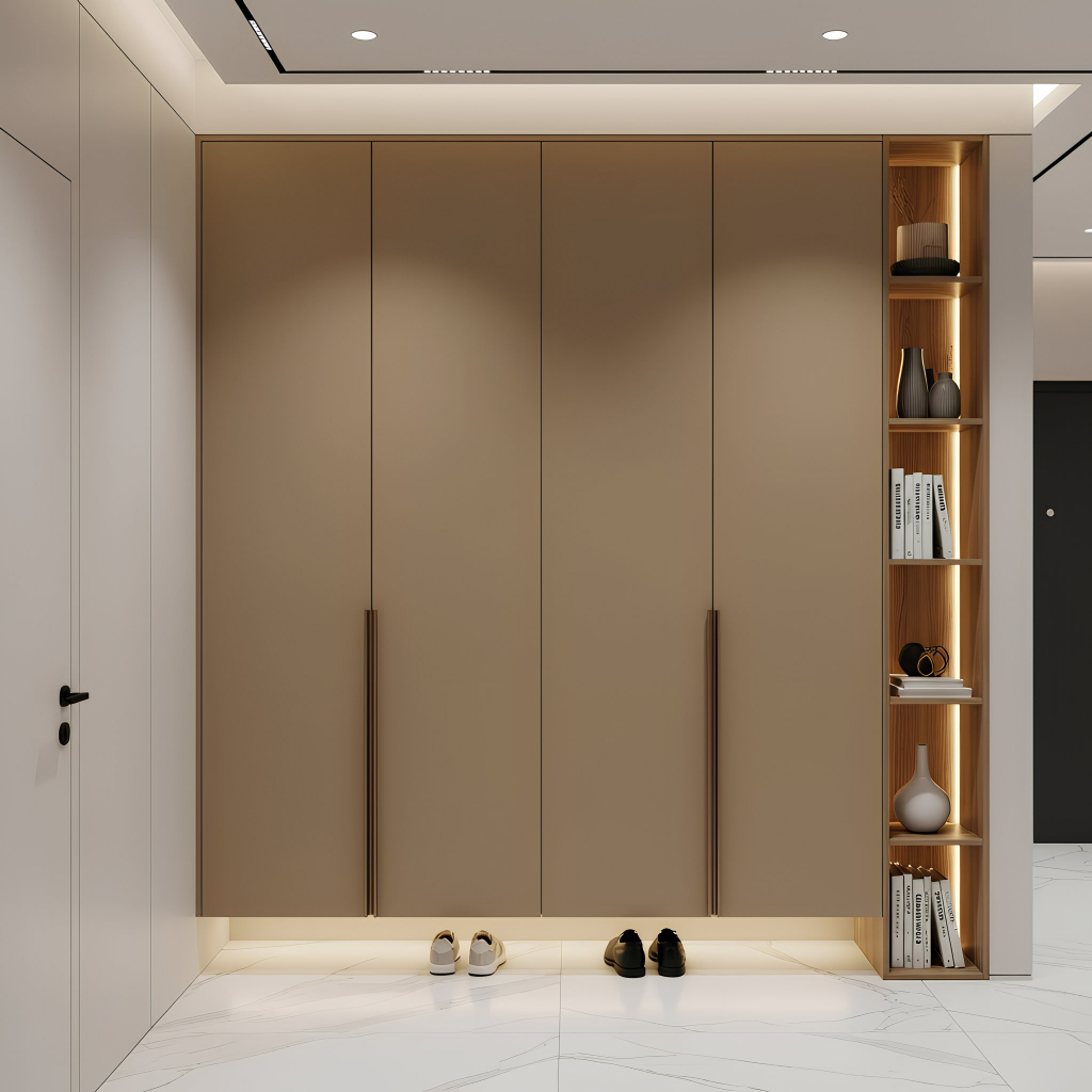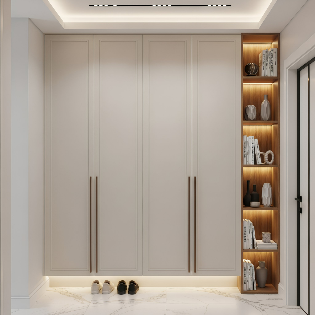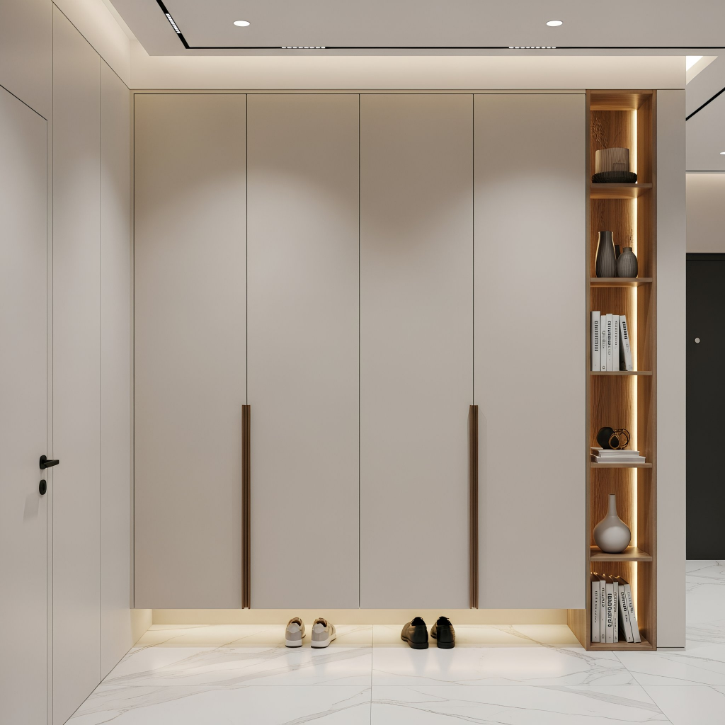 Пример современного минимализма, доведённого до идеальной чистоты: гладкие фасады без фрезеровки формируют спокойную плоскость, а длинные вертикальные ручки в тёплом оттенке задают строгий ритм всей композиции. Пристенный стеллаж с подсветкой добавляет акцента и делает конструкцию функциональнее, не нарушая общей лаконичности. Модель выглядит лёгкой, технологичной и очень собранной — именно такой шкаф задаёт порядок и стиль в прихожей с первого взгляда.