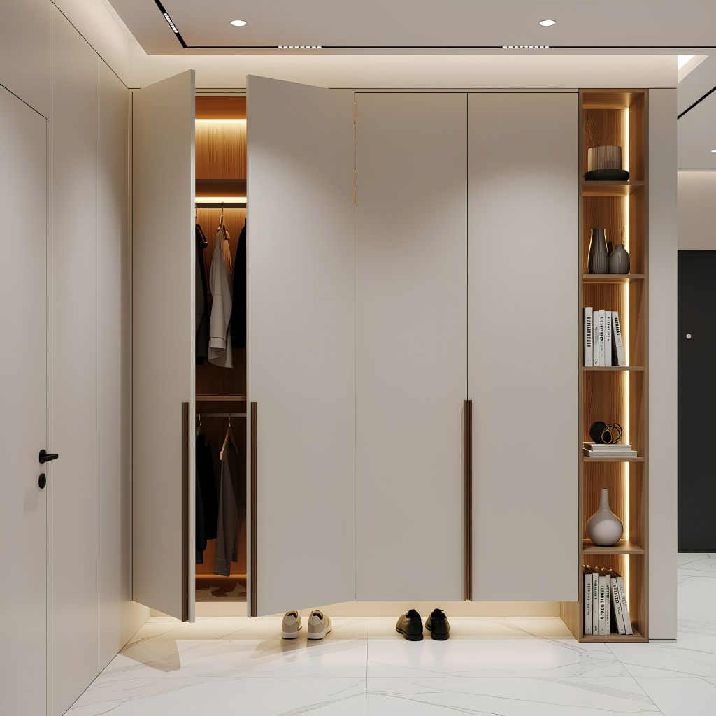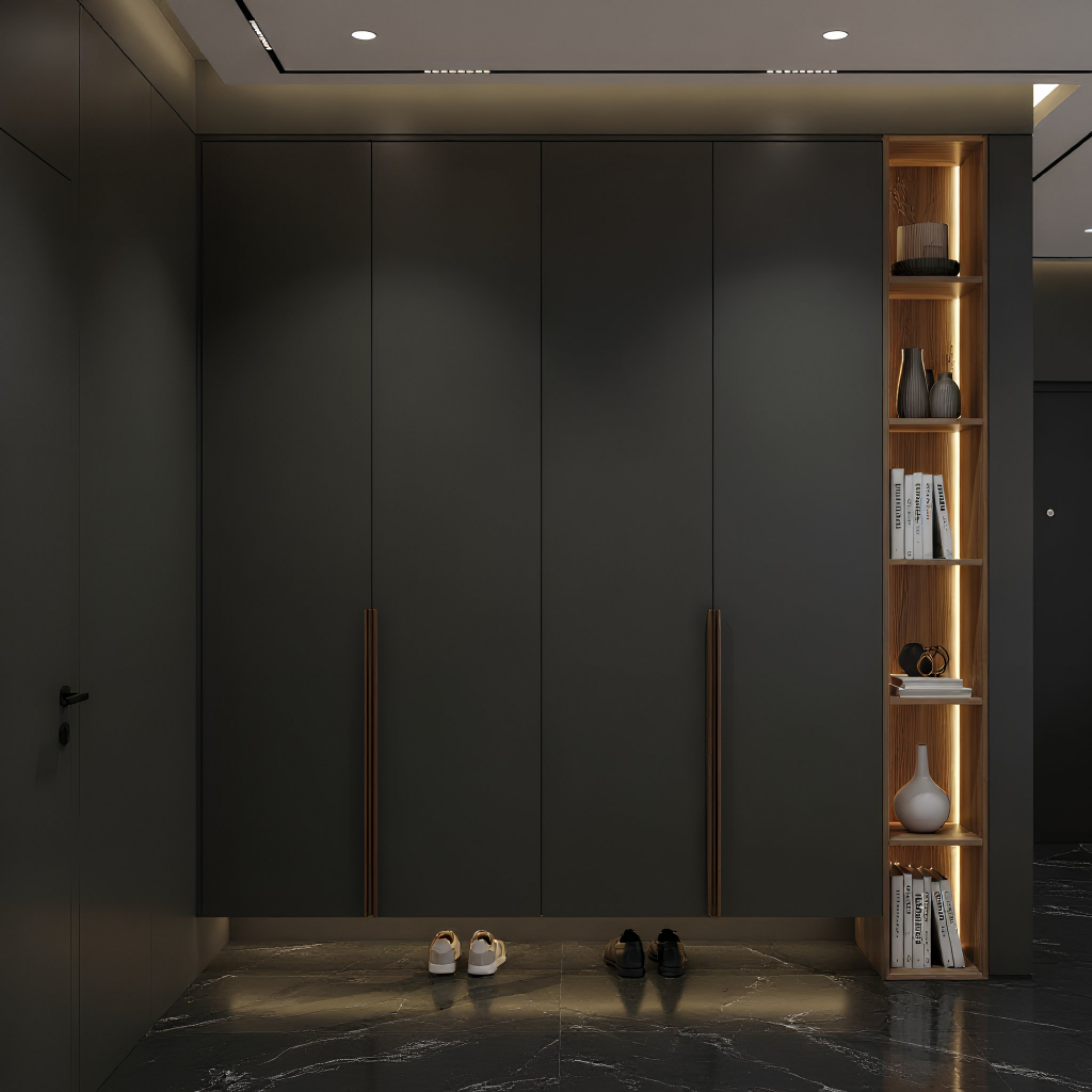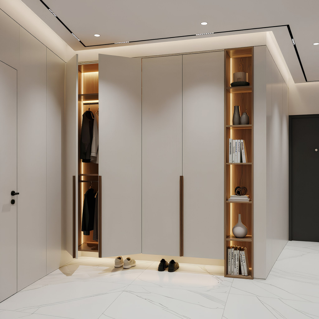 Пример современного минимализма, доведённого до идеальной чистоты: гладкие фасады без фрезеровки формируют спокойную плоскость, а длинные вертикальные ручки в тёплом оттенке задают строгий ритм всей композиции. Пристенный стеллаж с подсветкой добавляет акцента и делает конструкцию функциональнее, не нарушая общей лаконичности. Модель выглядит лёгкой, технологичной и очень собранной — именно такой шкаф задаёт порядок и стиль в прихожей с первого взгляда.