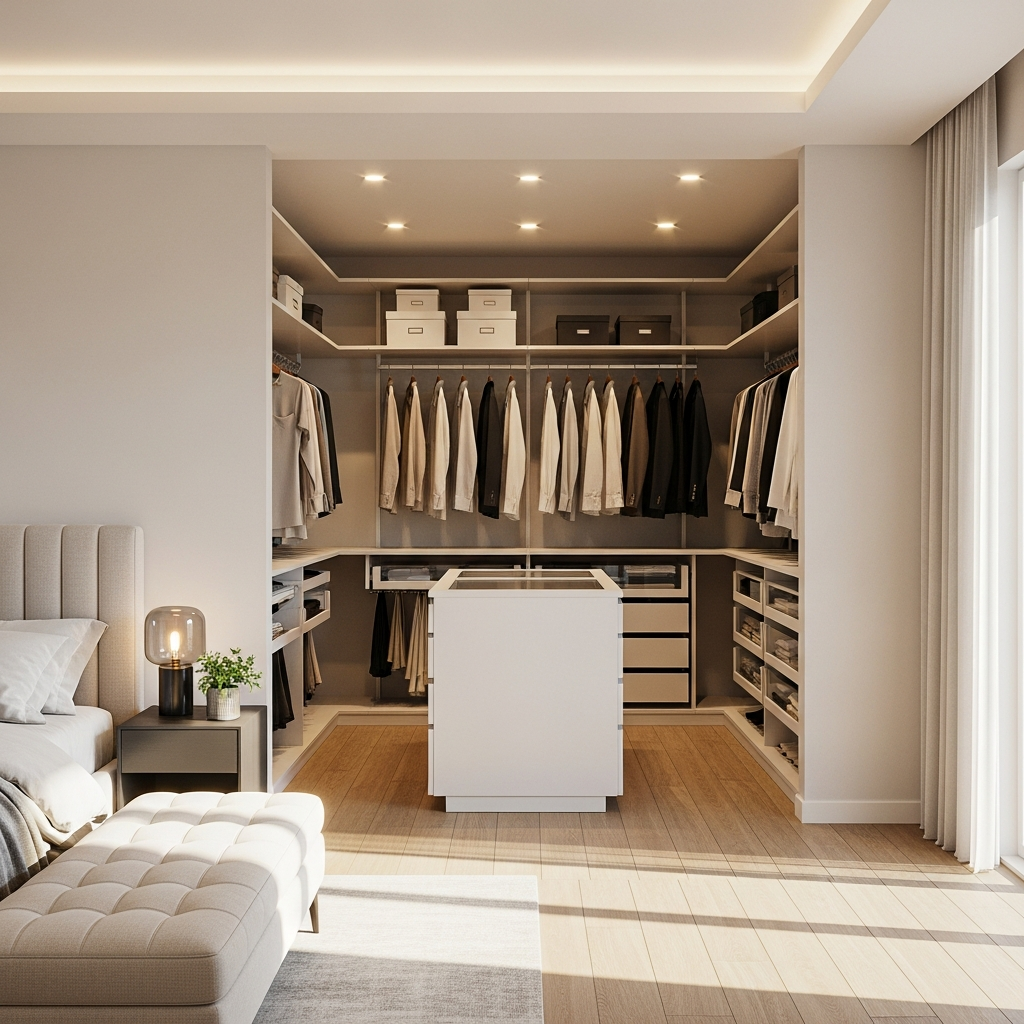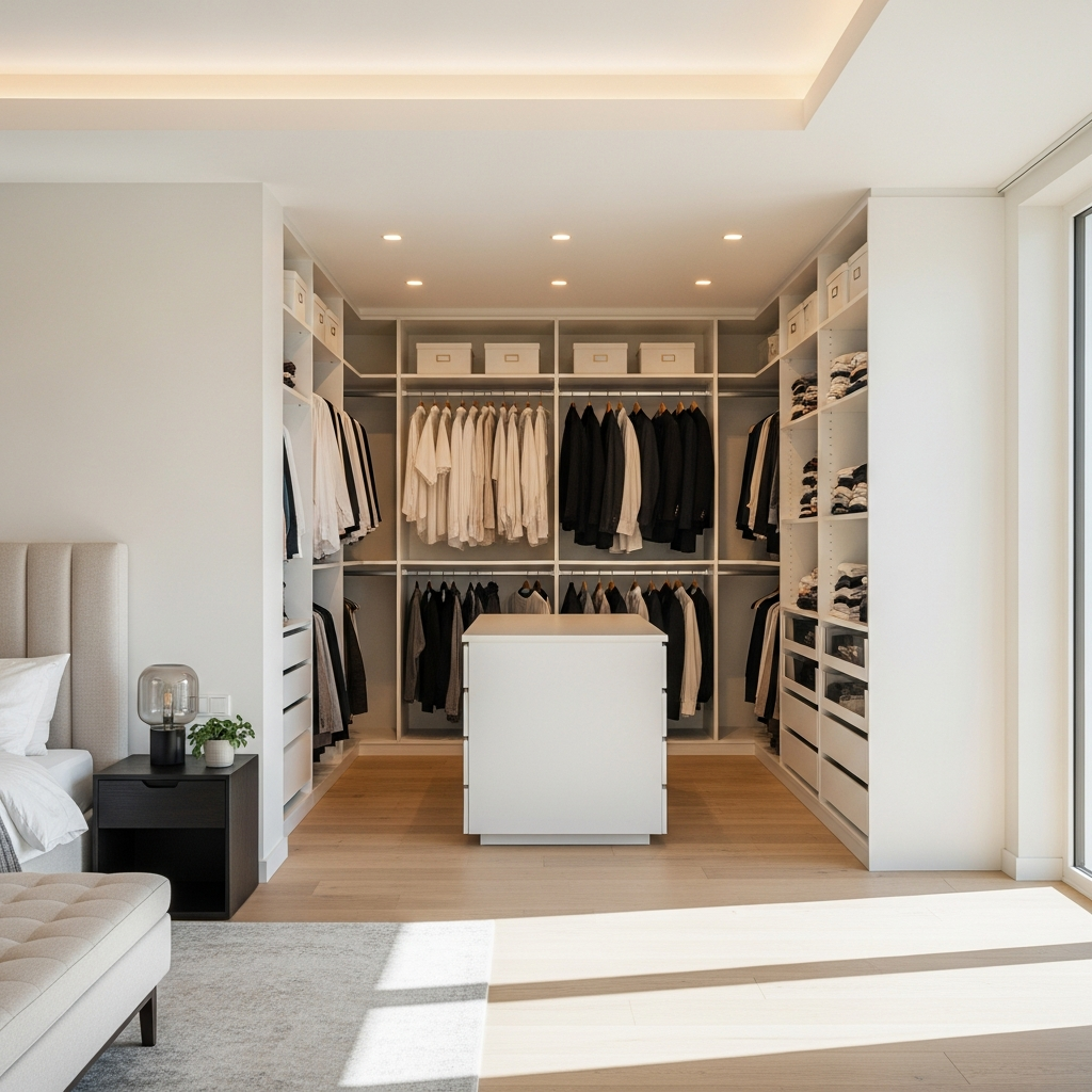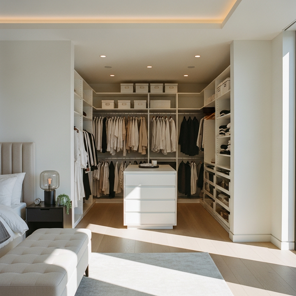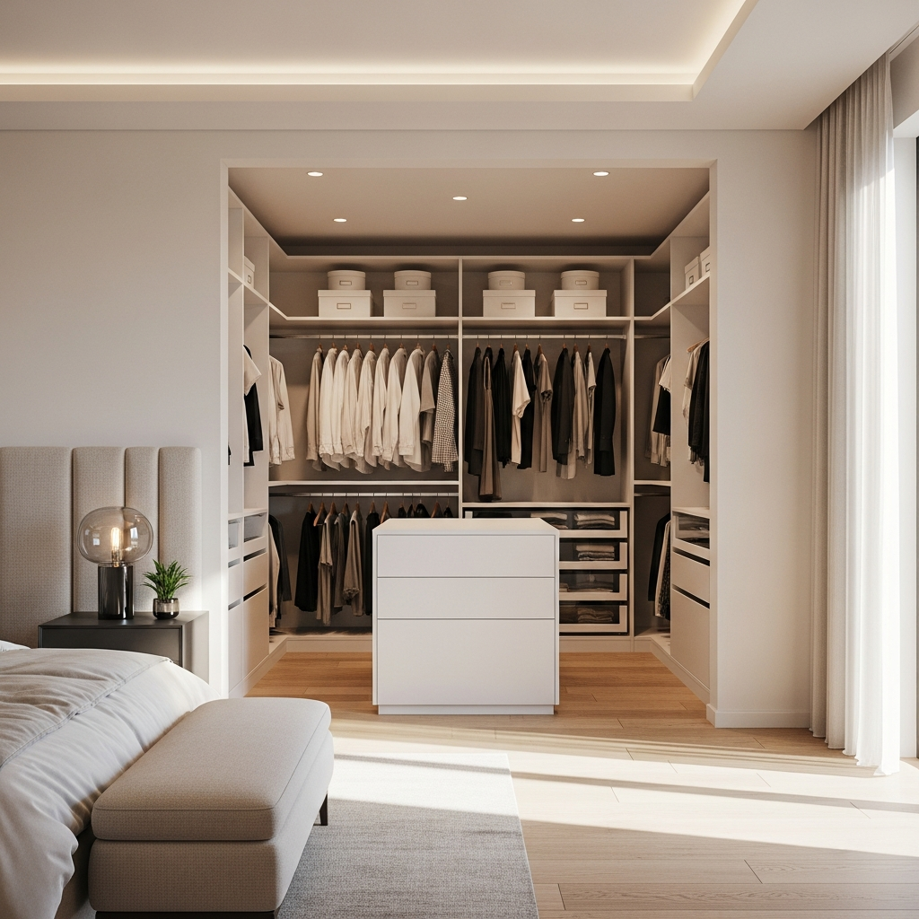 Открытая гардеробная зона, собранная в идеальную симметрию, где каждый метр работает на порядок и комфорт: широкие секции для одежды, удобные полки, выдвижные системы и центральный остров-комод создают ощущение простора и продуманности, а мягкий рассеянный свет подчеркивает аккуратность, превращая хранение вещей в ежедневный ритуал удовольствия.