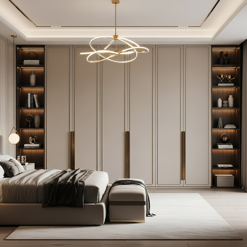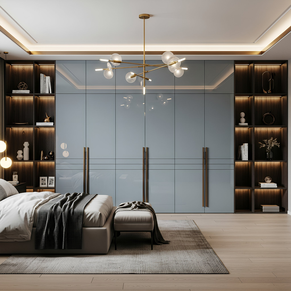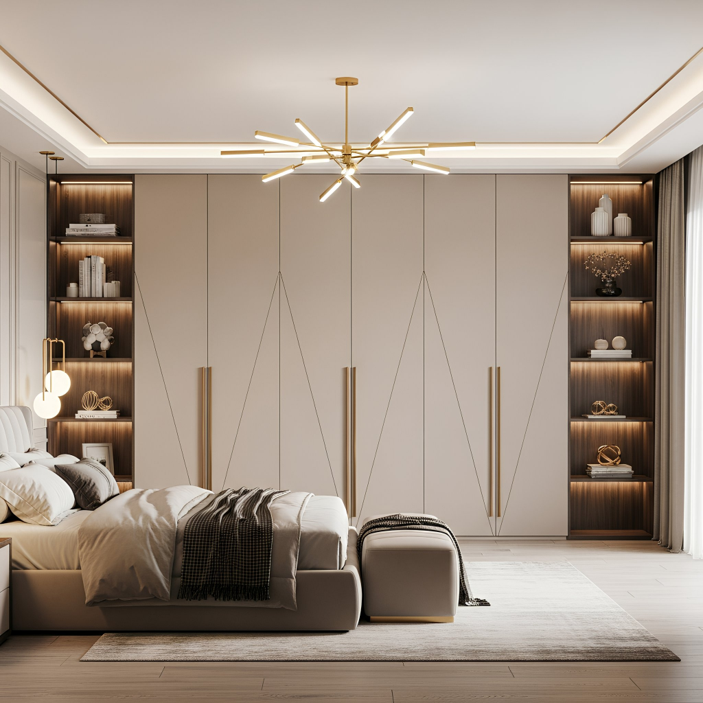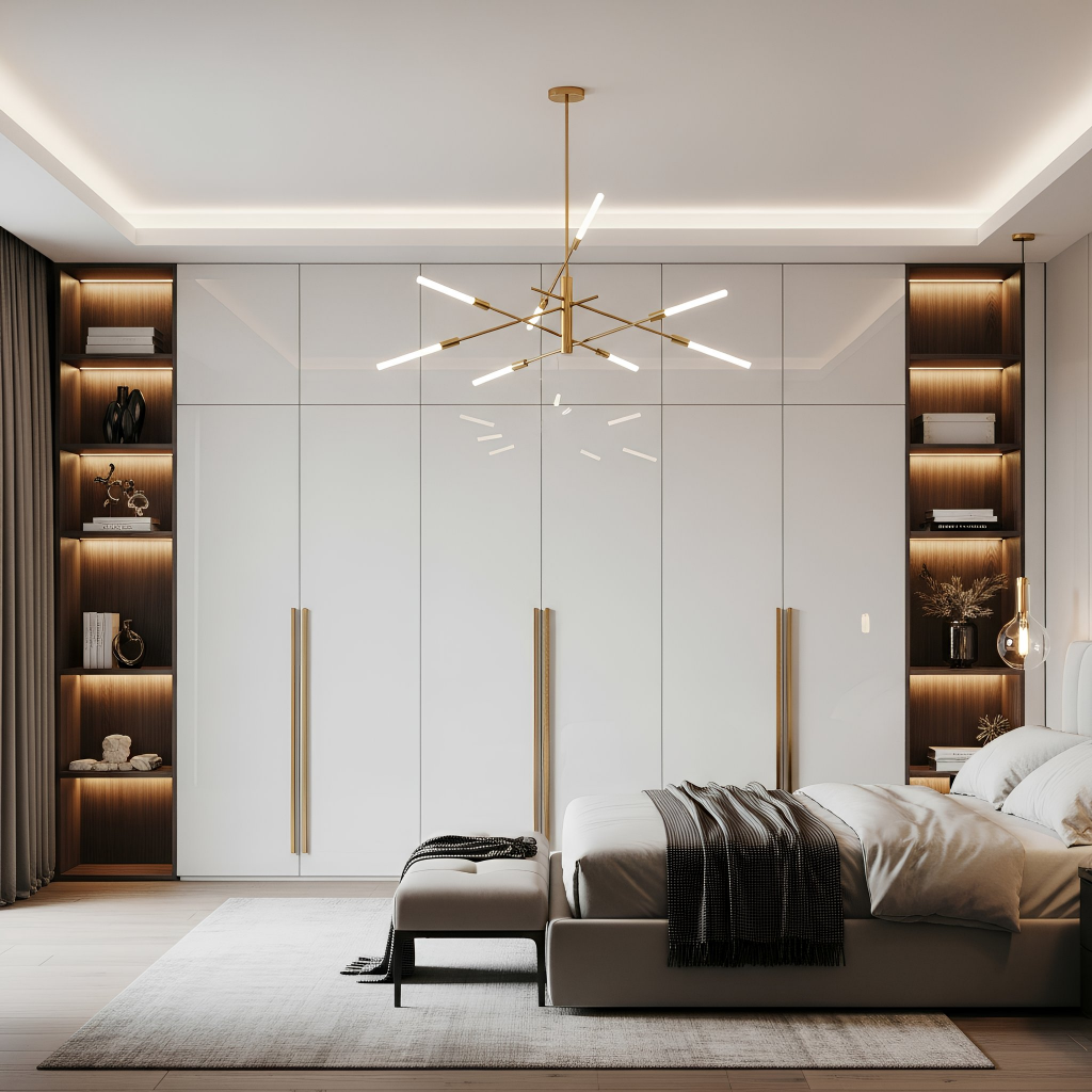 Гладкие фасады, встроенные ниши и длинные вертикальные ручки собраны в минималистичную архитектуру, где порядок и симметрия выглядят как спокойная сила; открытые боковые витрины с тёплой подсветкой добавляют мягкий акцент, превращая шкаф в спокойный центр спальни — строгий, современный и по-настоящему уютный