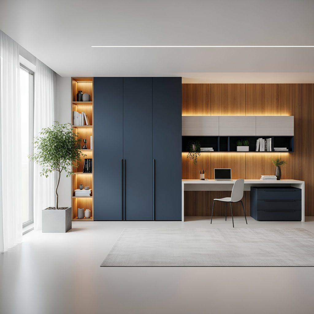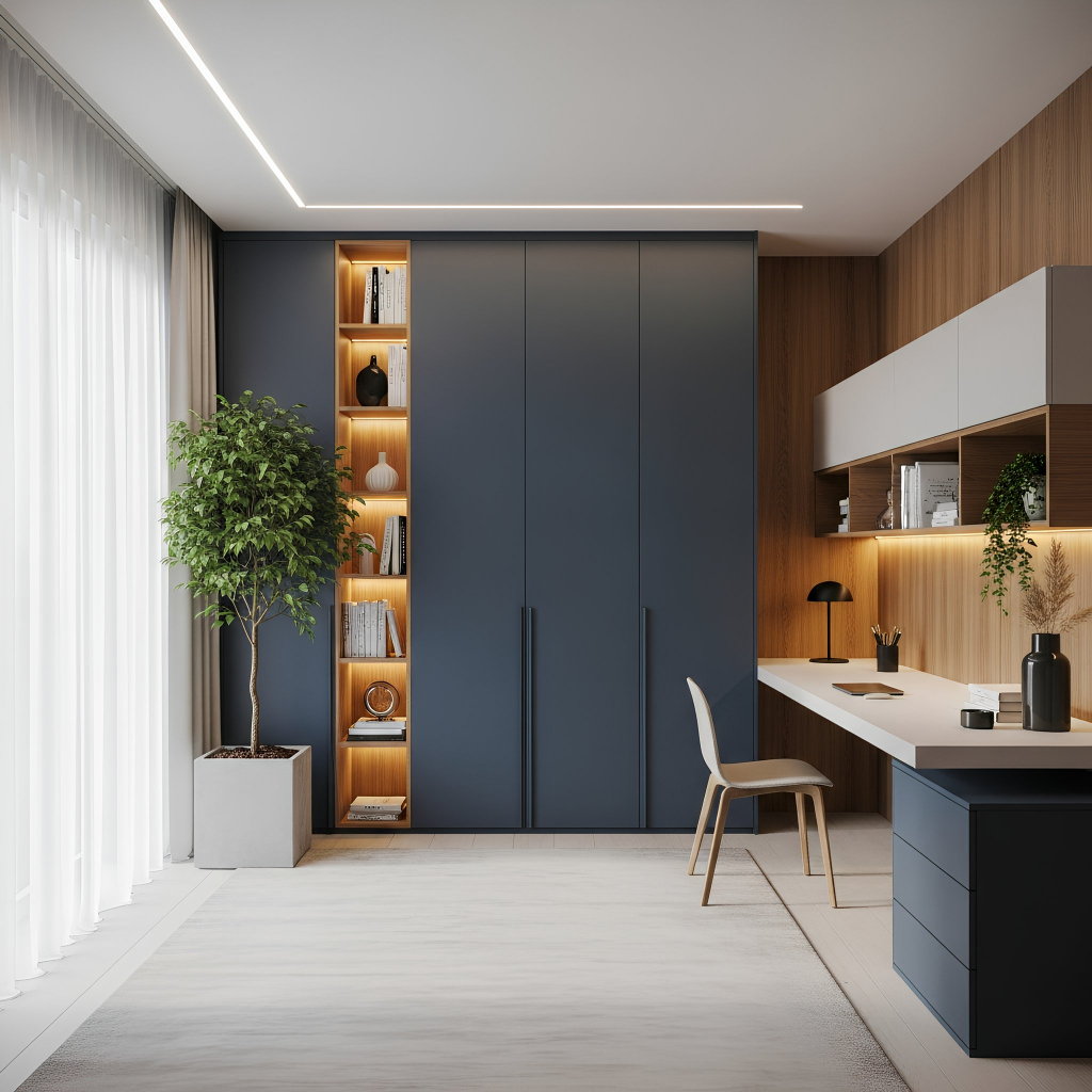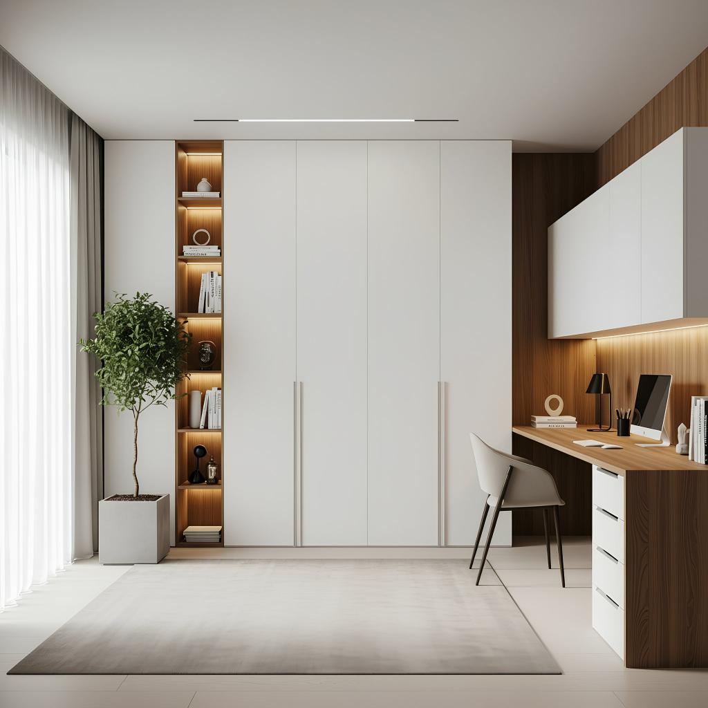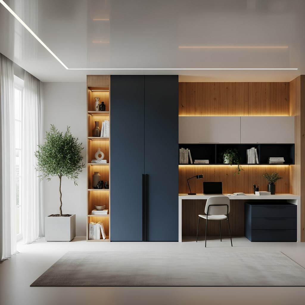 Гладкие современные фасады в минималистичном исполнении соединяются с тёплой деревянной нишей, создавая баланс строгой геометрии и уютной текстуры; встроенная подсветка подчёркивает ритм открытых полок, а рабочая зона в единой линии со шкафом формирует целостный, функциональный кабинет, где всё выглядит продуманно, технологично и эстетично одновременно.