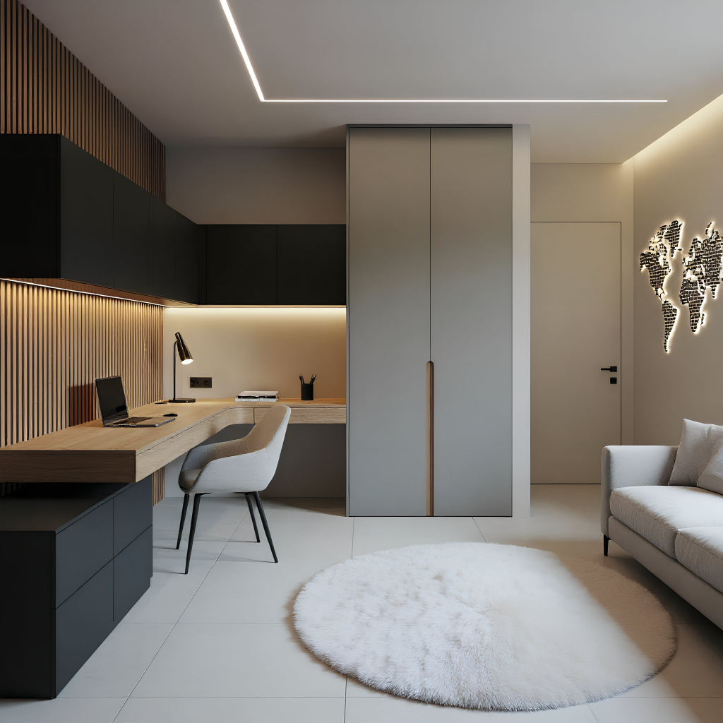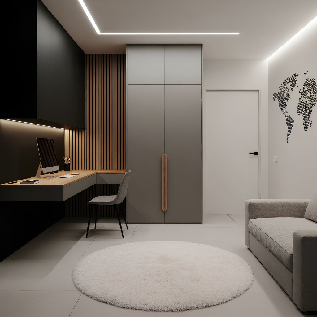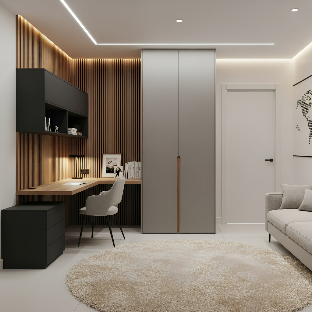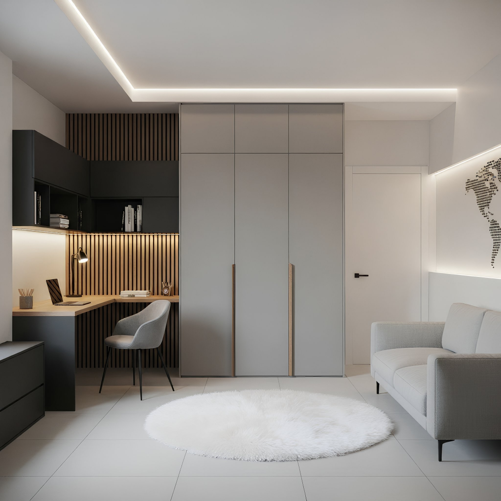 Гладкие фасады с матовой глубиной и акцентной деревянной ручкой собираются в спокойную, но уверенную композицию, где минимализм соединён с теплом натуральной текстуры. Вертикальная реечная панель и парящий рабочий стол добавляют ритма и создают ощущение продуманного, собранного пространства — современного, аккуратного и по-настоящему функционального.