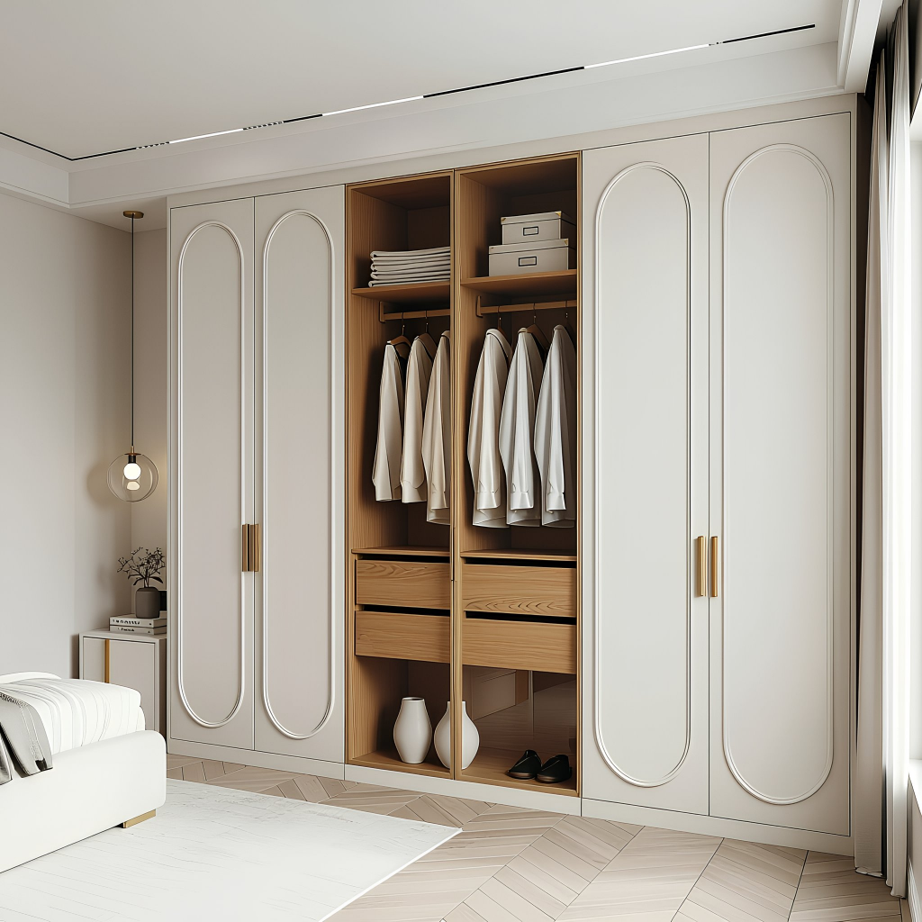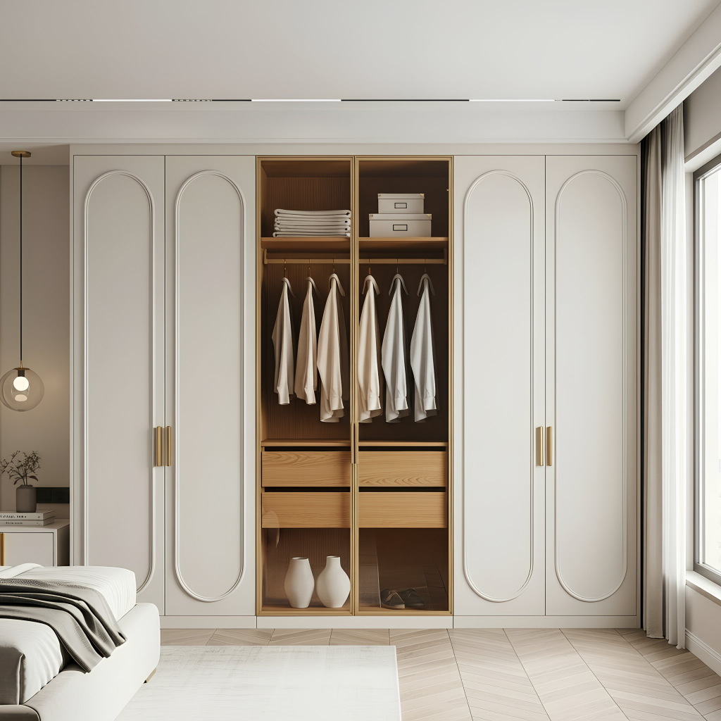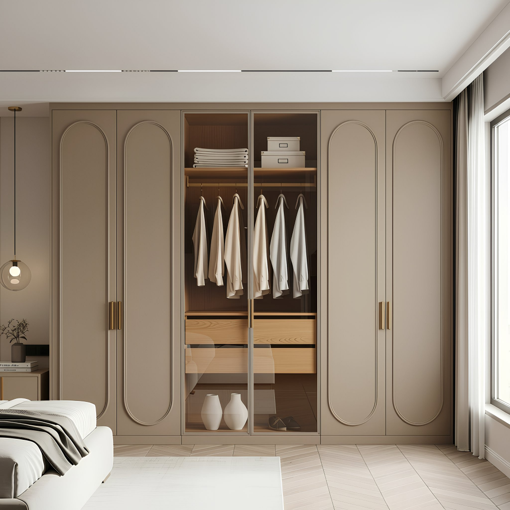 Мягкая неоклассика в современном исполнении: округлые филёнки создают плавный ритм по всей стене, а центральная витрина с аккуратным деревянным нутром добавляет лёгкости и глубины. Длинные вертикальные ручки подчёркивают высоту фасадов, делая конструкцию стройной и элегантной. Модель выглядит цельной и утончённой, без лишнего декора — именно та сбалансированная эстетика, которая подходит и для спокойной спальни, и для стильной гардеробной.