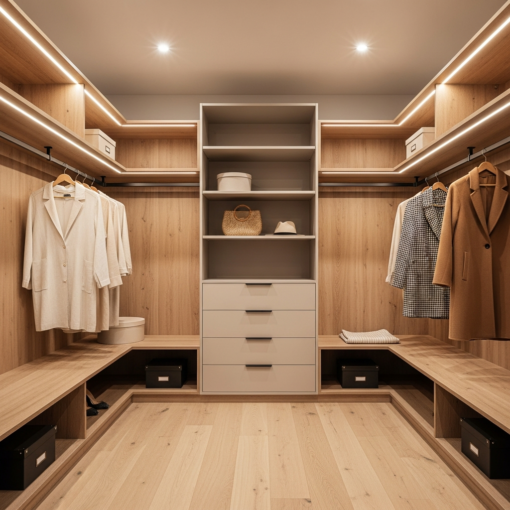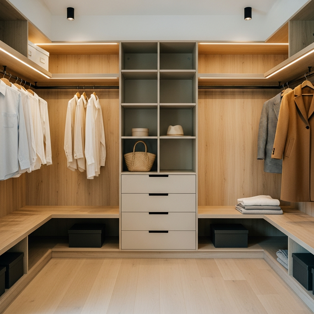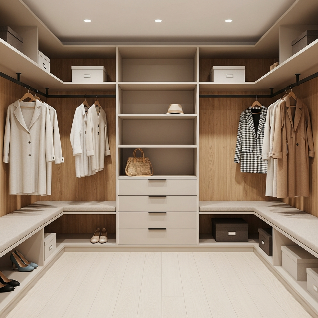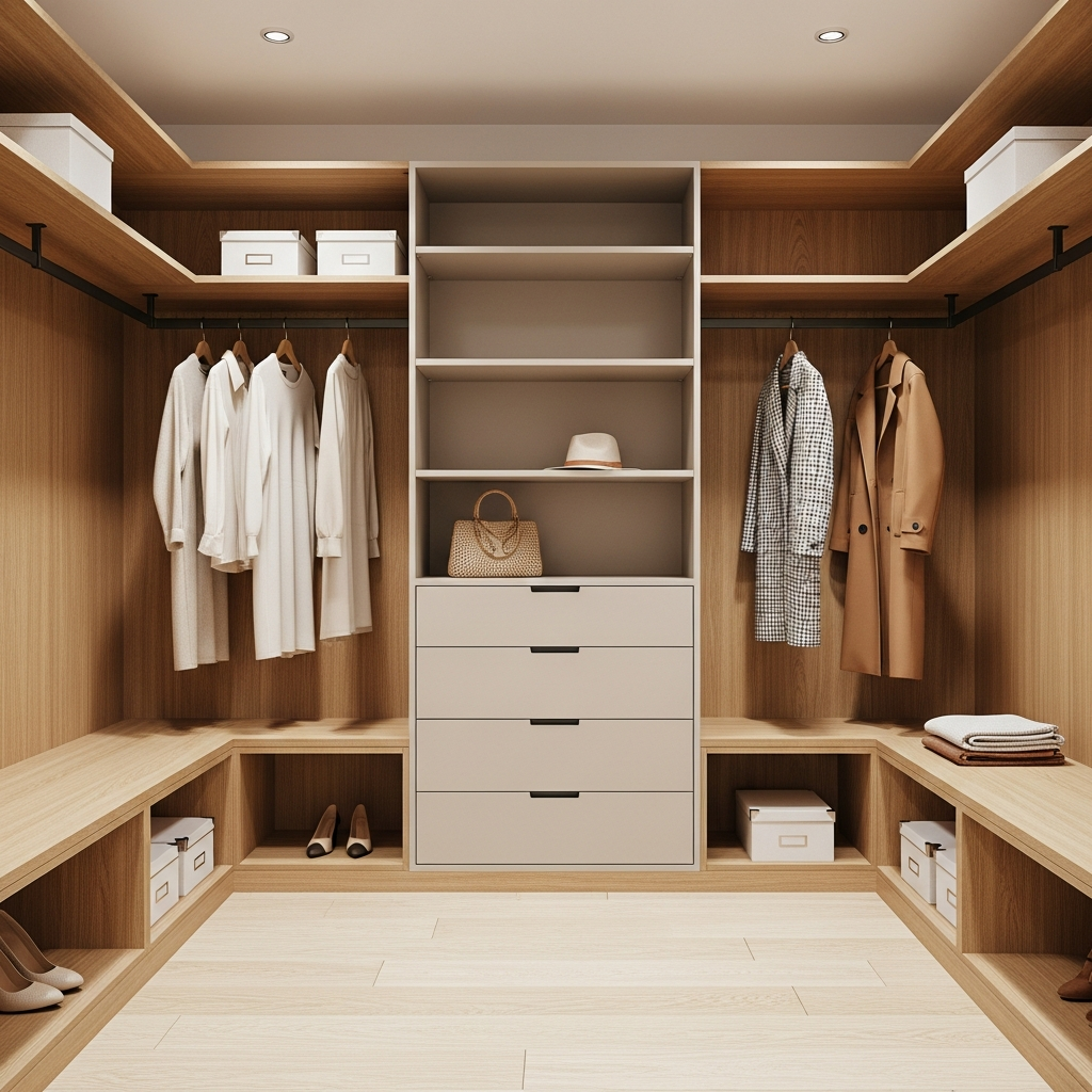 Лаконичная гардеробная с мягкой атмосферой, где центральный блок с полками и ящиками собирает всю композицию, а открытые угловые зоны дают много воздуха и удобства: одежда висит свободно, обувь расставлена аккуратно, полки под коробки и аксессуары работают на порядок, и всё пространство выглядит спокойным, продуманным и уютным.