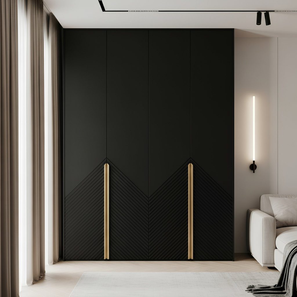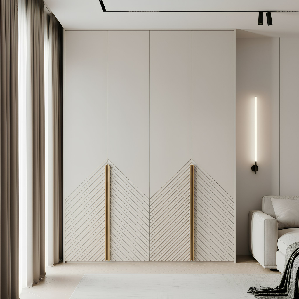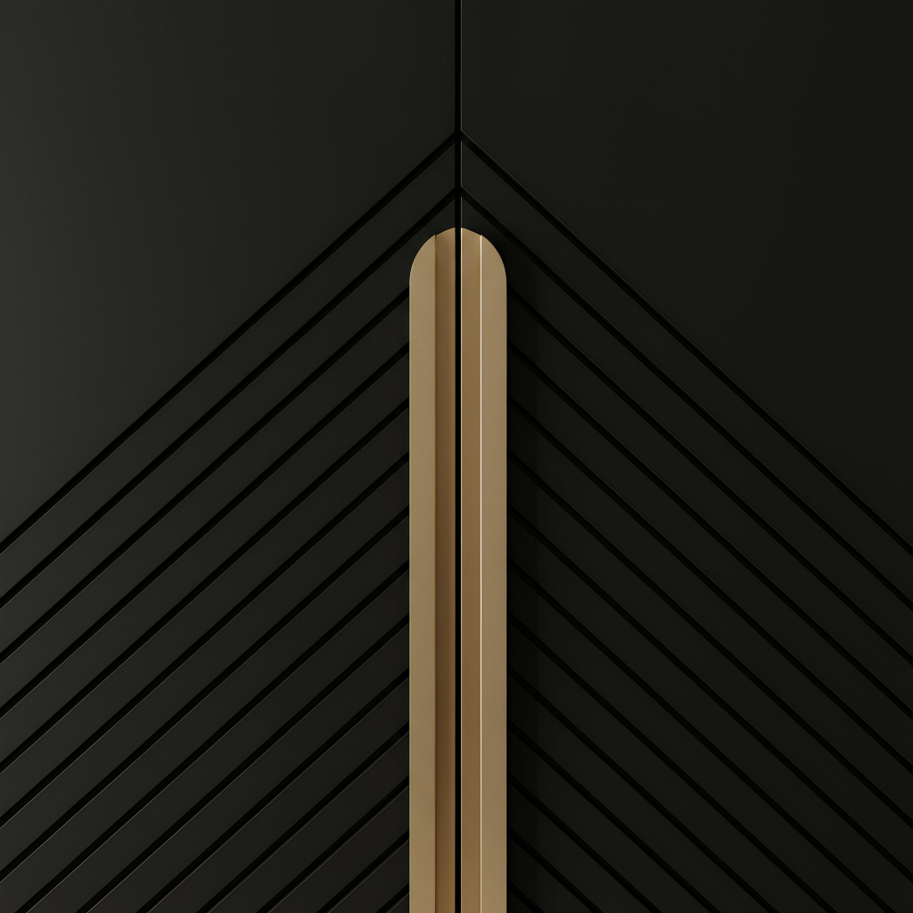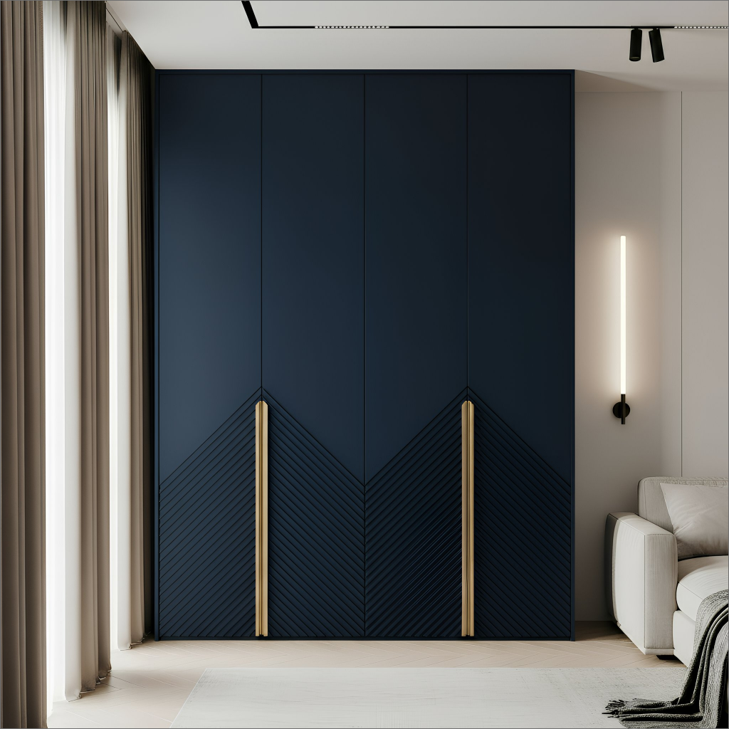 Этот шкаф — чистая современная архитектура: графичная диагональная фрезеровка, собранная в чёткую «V»-композицию, и длинные вертикальные ручки создают ощущение уверенной силы и геометрической выверенности. Плоские верхние фасады подчёркивают минимализм, а нижний ритм линий добавляет глубину и характер. Модель выглядит цельной, собранной и технологичной — такой шкаф сразу задаёт тон пространству и делает интерьер по-настоящему зрелым.