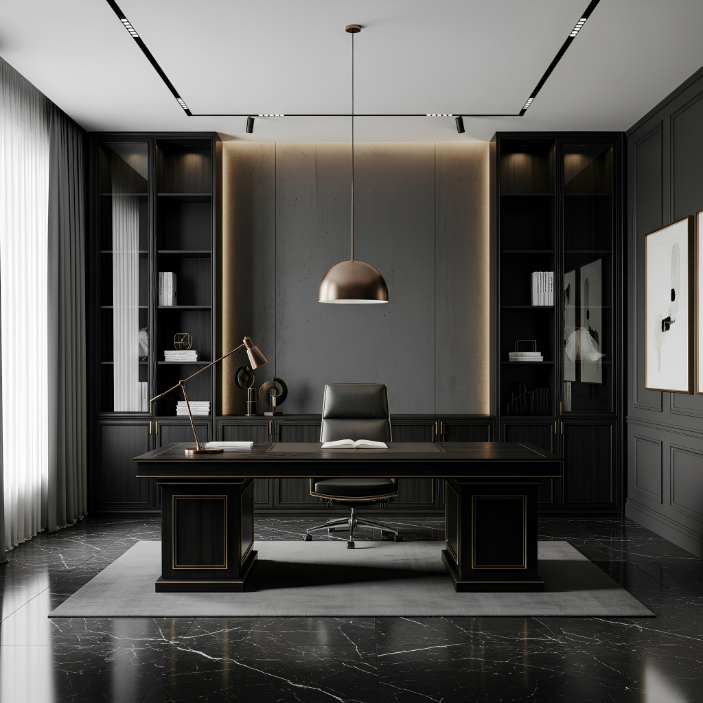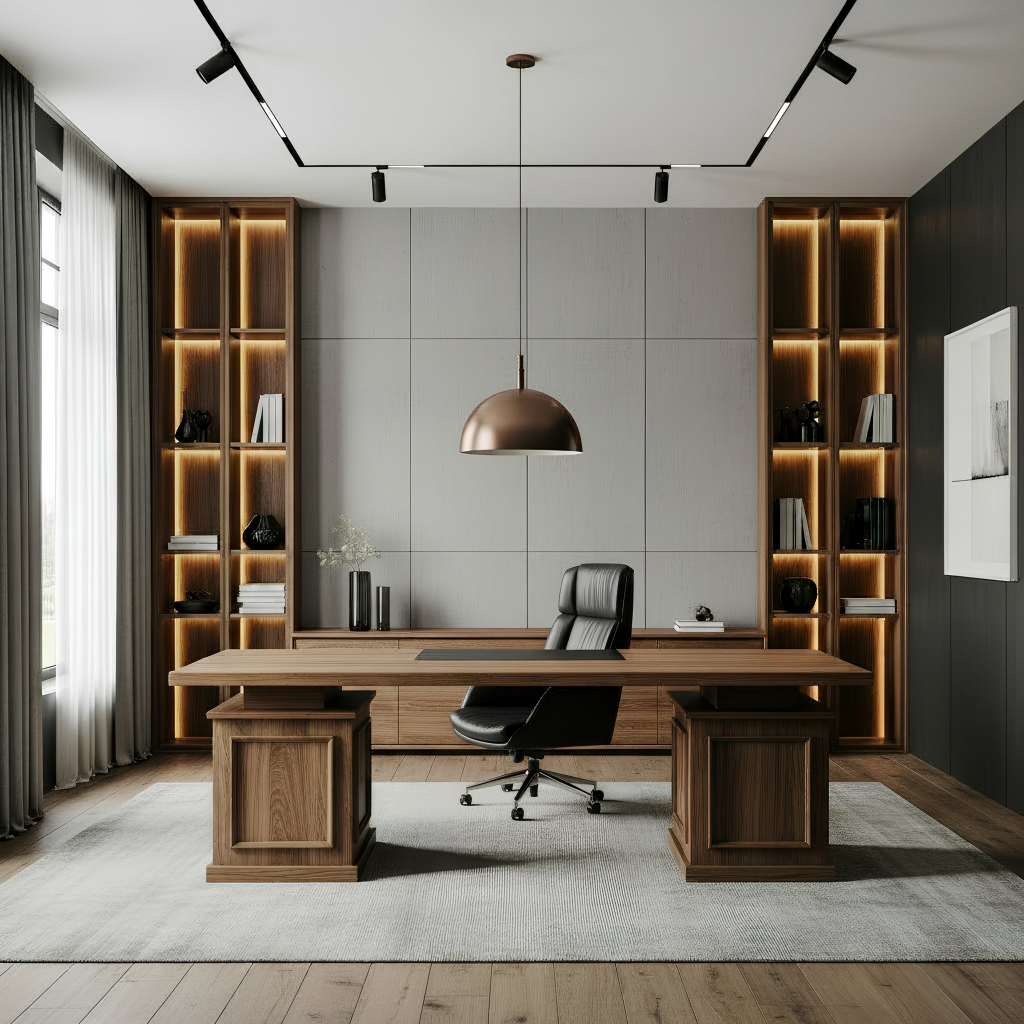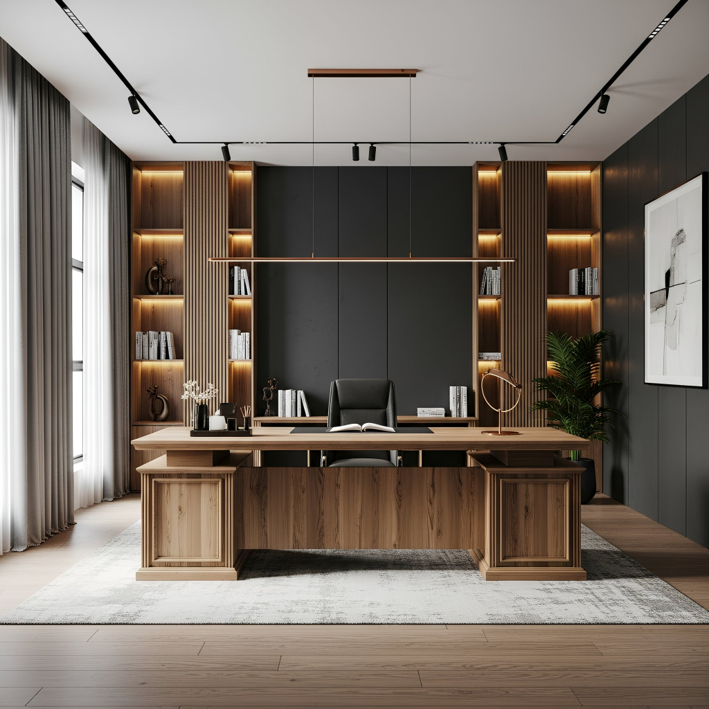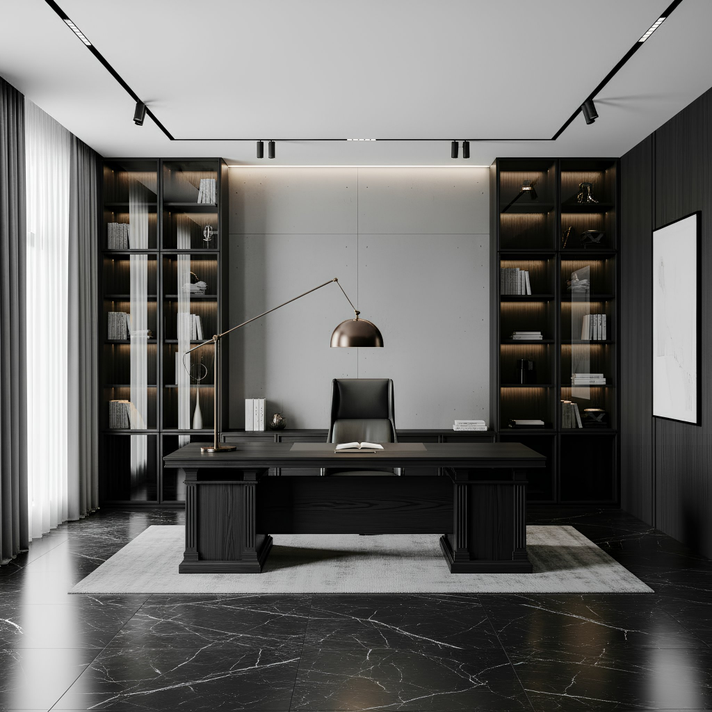 Композиция выстроена как уверенный, статусный центр пространства: строгие вертикальные плоскости, глубокие ниши с мягкой подсветкой и массивный стол формируют архитектуру, в которой порядок сочетается с выразительной эстетикой. Чёткие линии, симметрия и продуманная расстановка элементов создают ощущение рабочего пространства, где продумано всё — от первого взгляда до последней детали, а атмосфера говорит о силе, концентрации и вкусе хозяина.