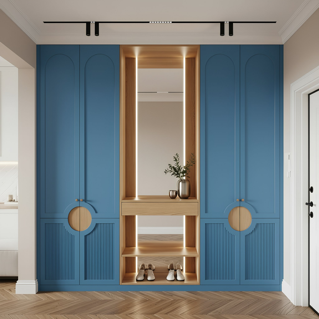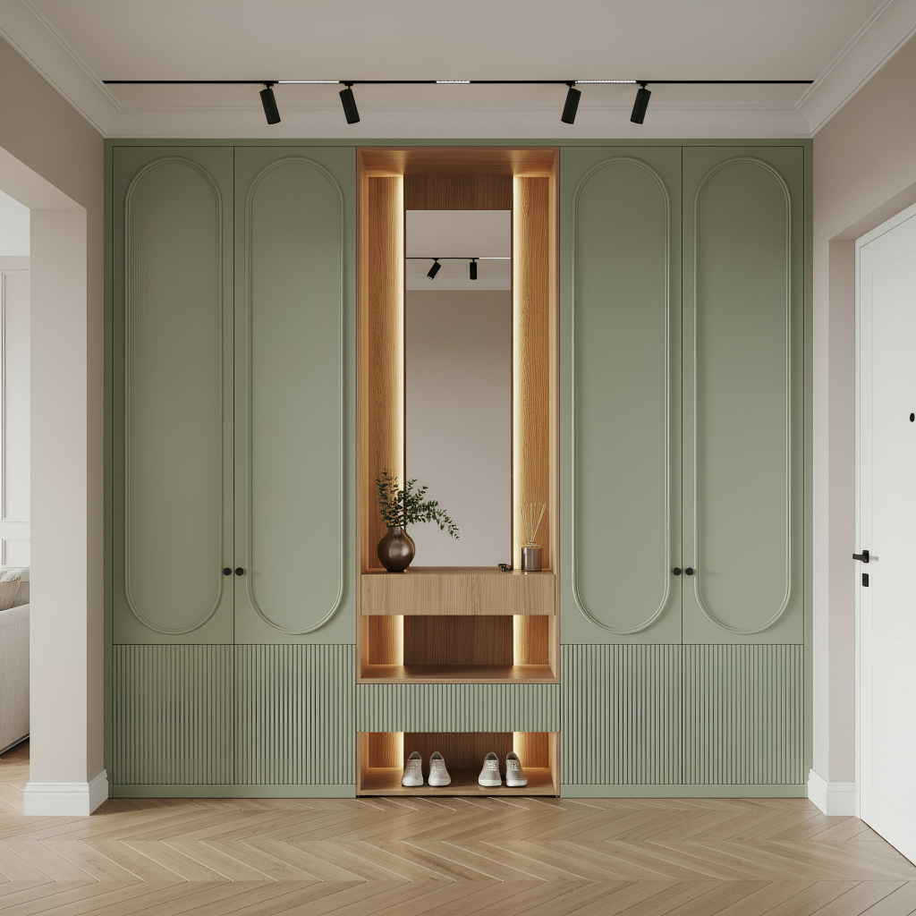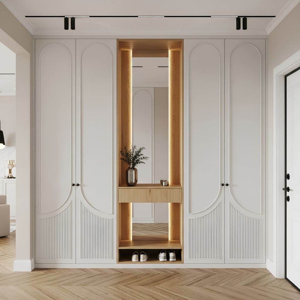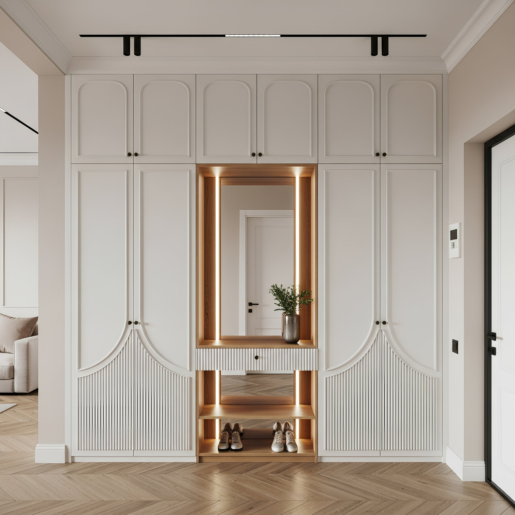 Аккуратные арочные филёнки, ритмичные вертикальные ламели внизу и тёплая ниша с подсветкой создают ощущение утончённого порядка, где каждая линия работает на гармонию. Он выглядит как продуманная архитектурная композиция: строгий каркас, плавные формы и тёплое дерево встречаются так естественно, будто это не мебель, а элемент интерьера, который «добавляет статус без лишних слов.