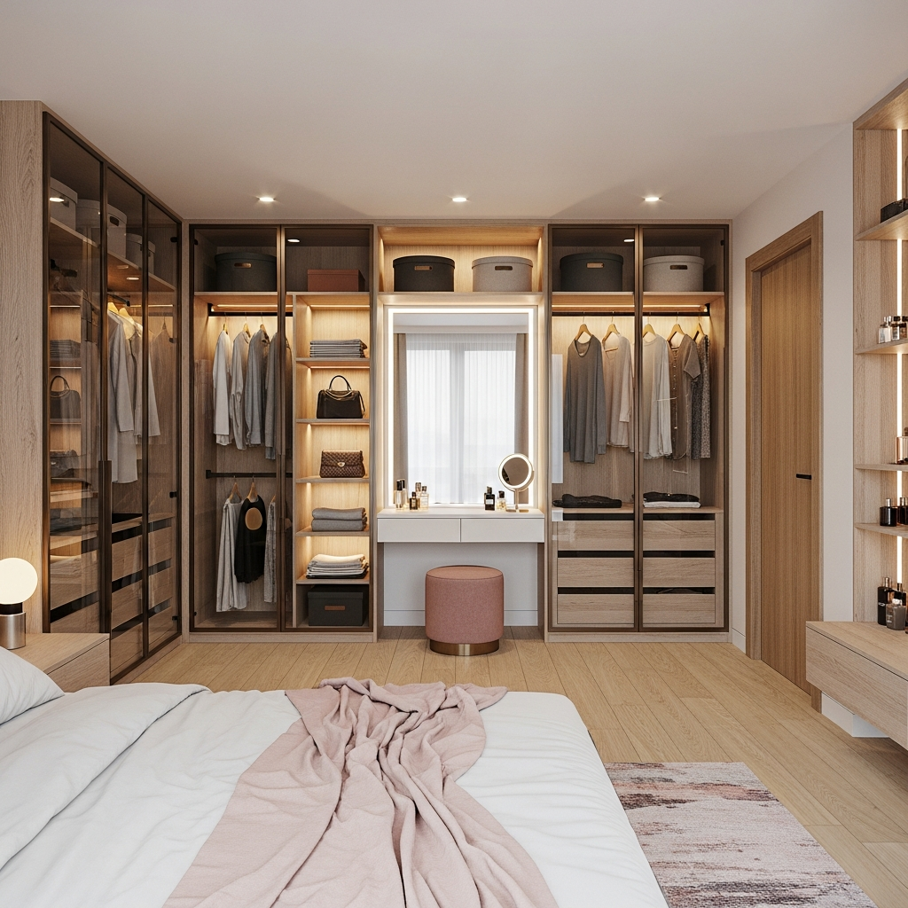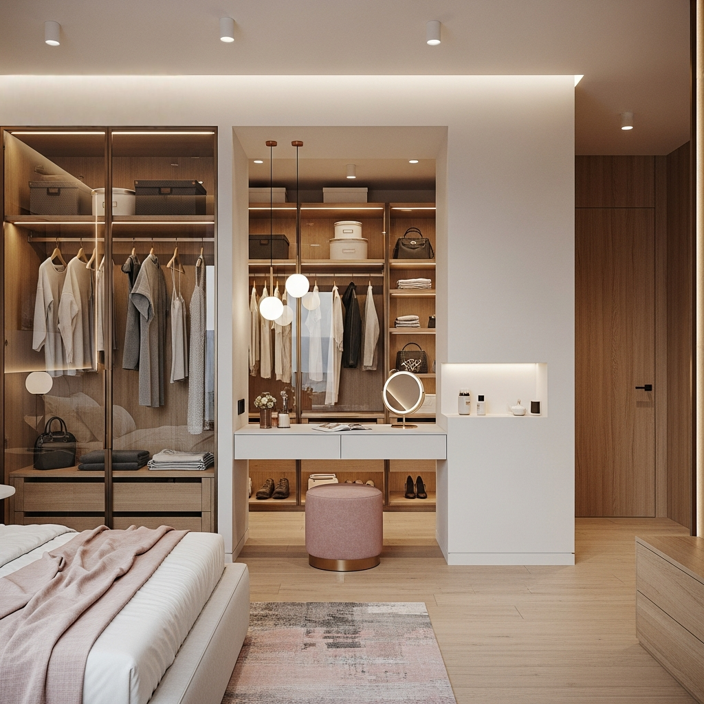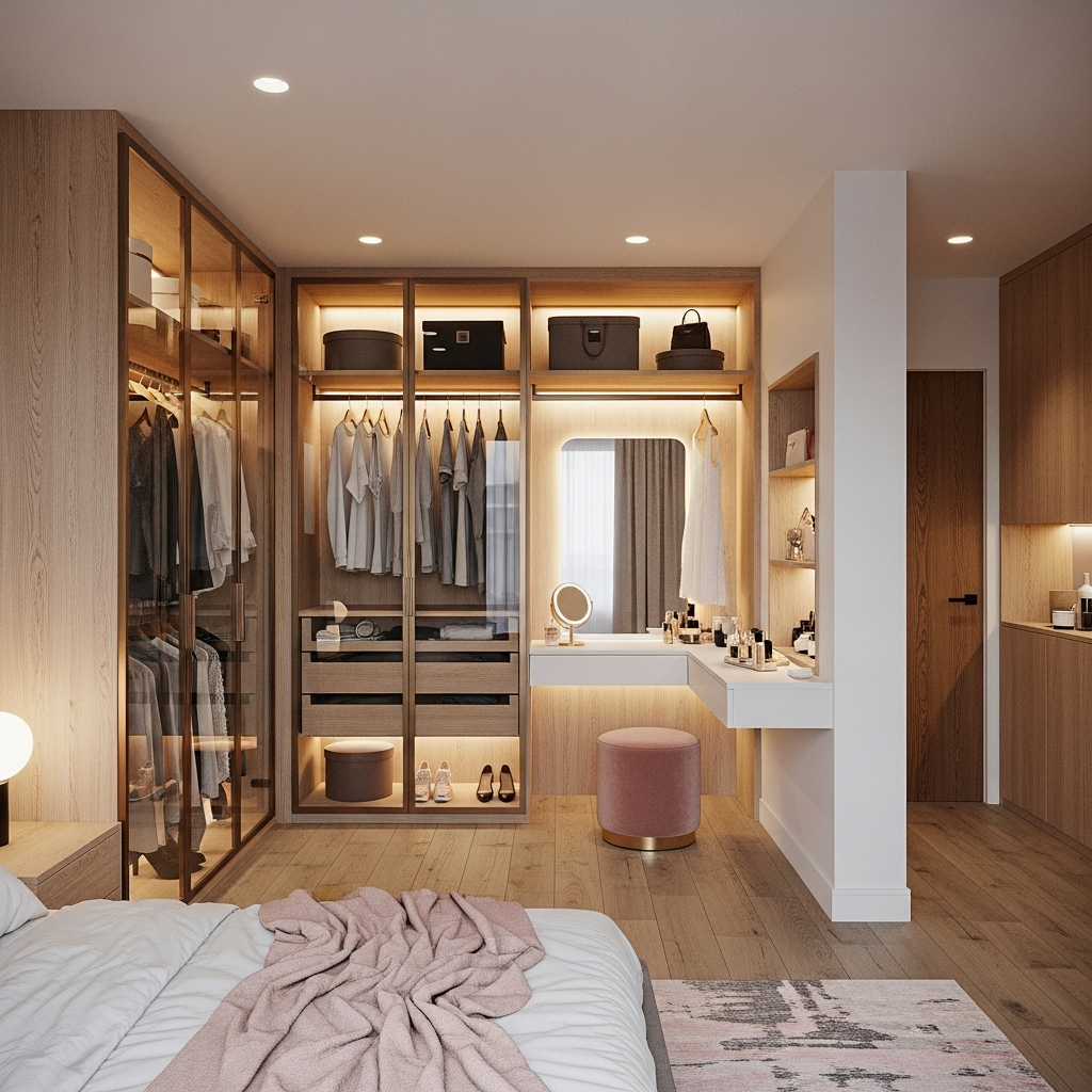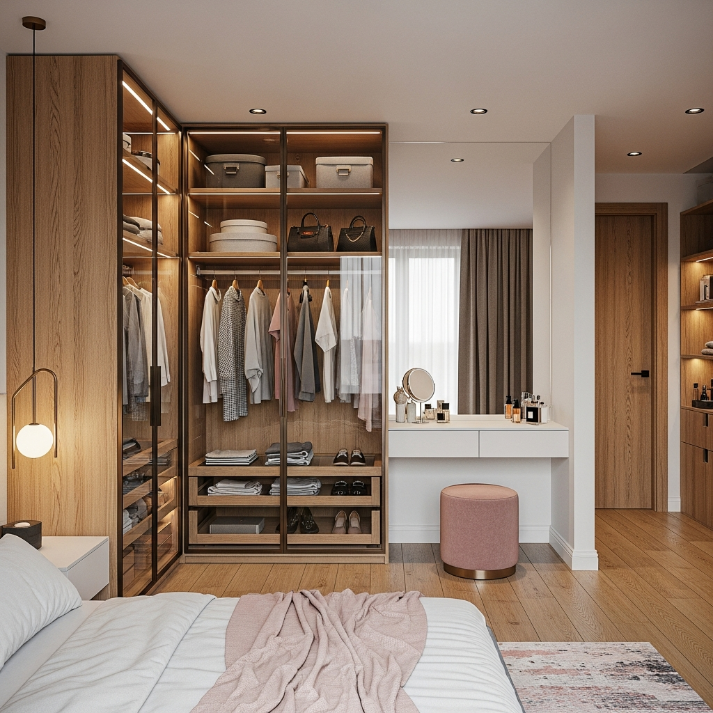 Лёгкая и тёплая гардеробная-комната, где стеклянные фасады, открытые секции и мягкая подсветка создают ощущение воздушности и порядка, а удобная зона с туалетным столиком превращает ежедневные сборы в приятный ритуал.