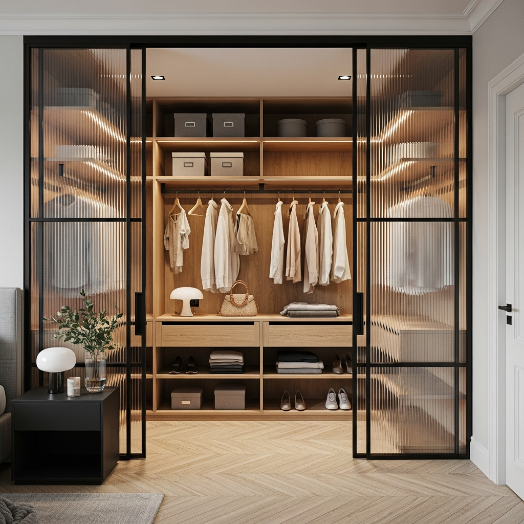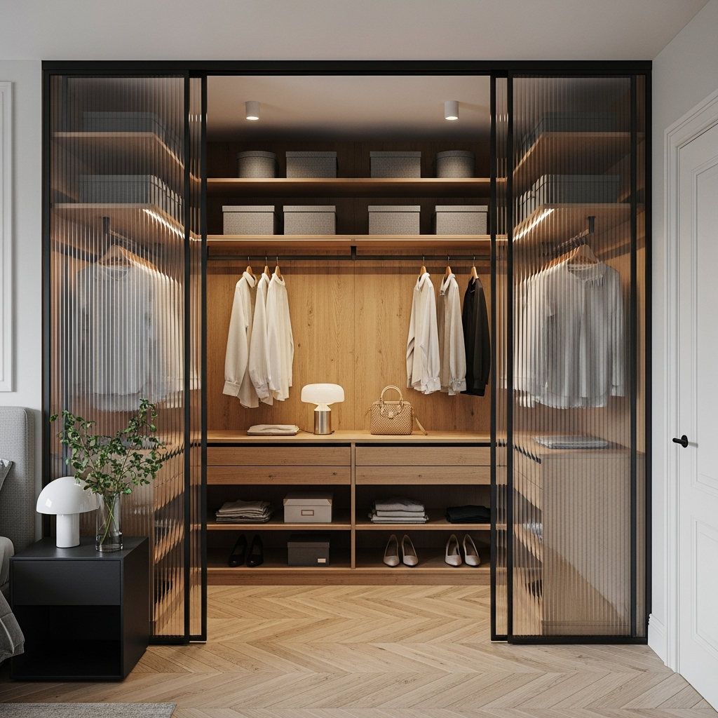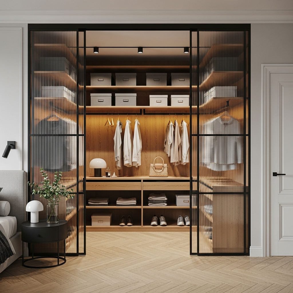 Чёткая, аккуратно выстроенная гардеробная с прозрачными рифлёными дверями, за которыми открывается тёплая композиция из ровных полок, мягкой подсветки и идеально организованных вещей — ощущение порядка, лёгкости и современного комфорта, когда всё нужное всегда на своём месте и под рукой.