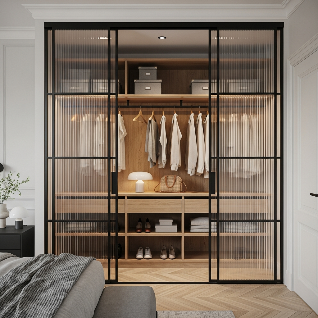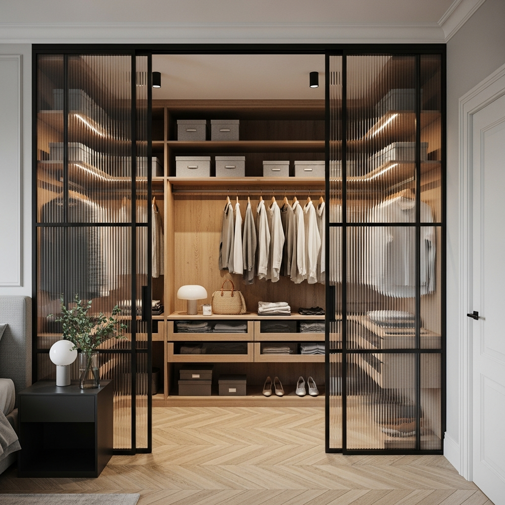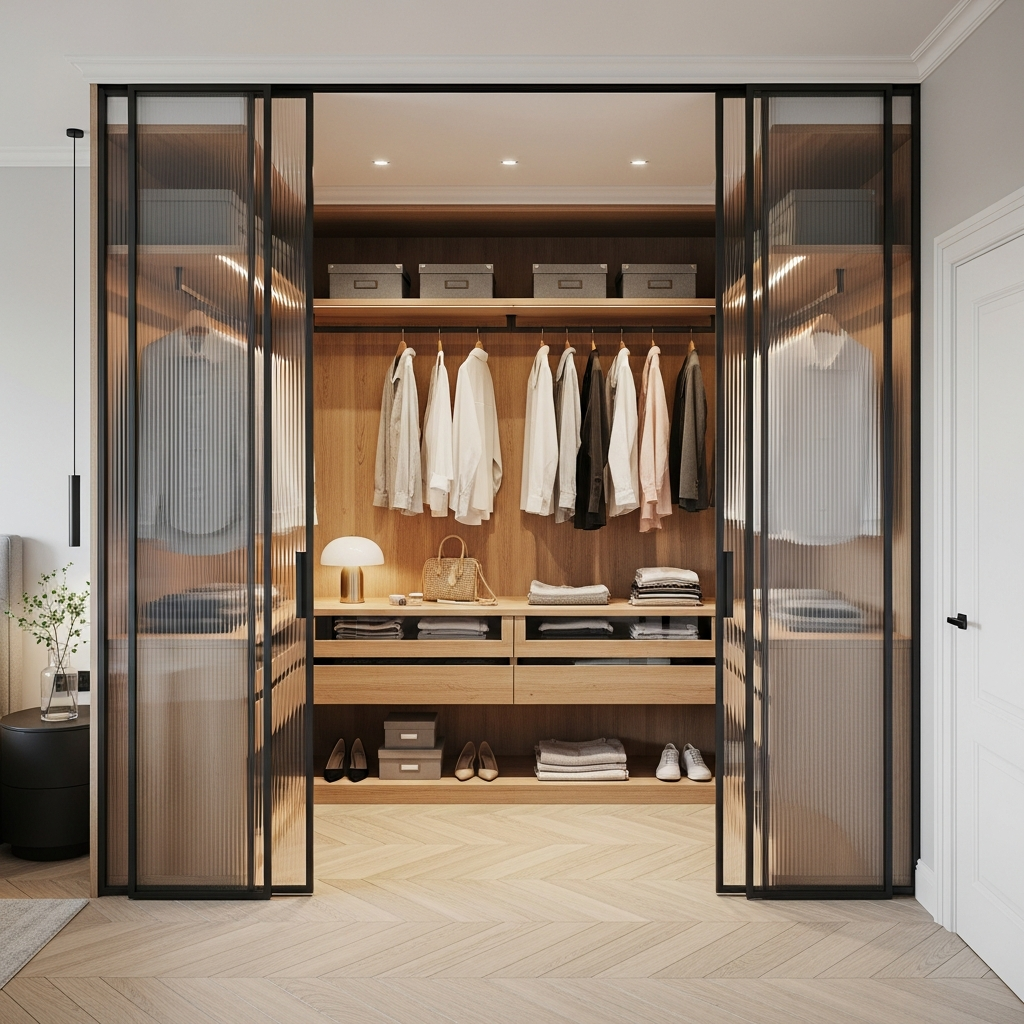 Чёткая, аккуратно выстроенная гардеробная с прозрачными рифлёными дверями, за которыми открывается тёплая композиция из ровных полок, мягкой подсветки и идеально организованных вещей — ощущение порядка, лёгкости и современного комфорта, когда всё нужное всегда на своём месте и под рукой.