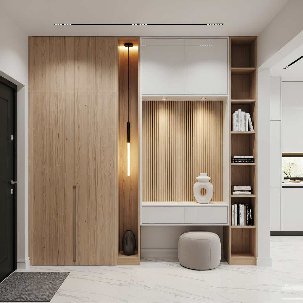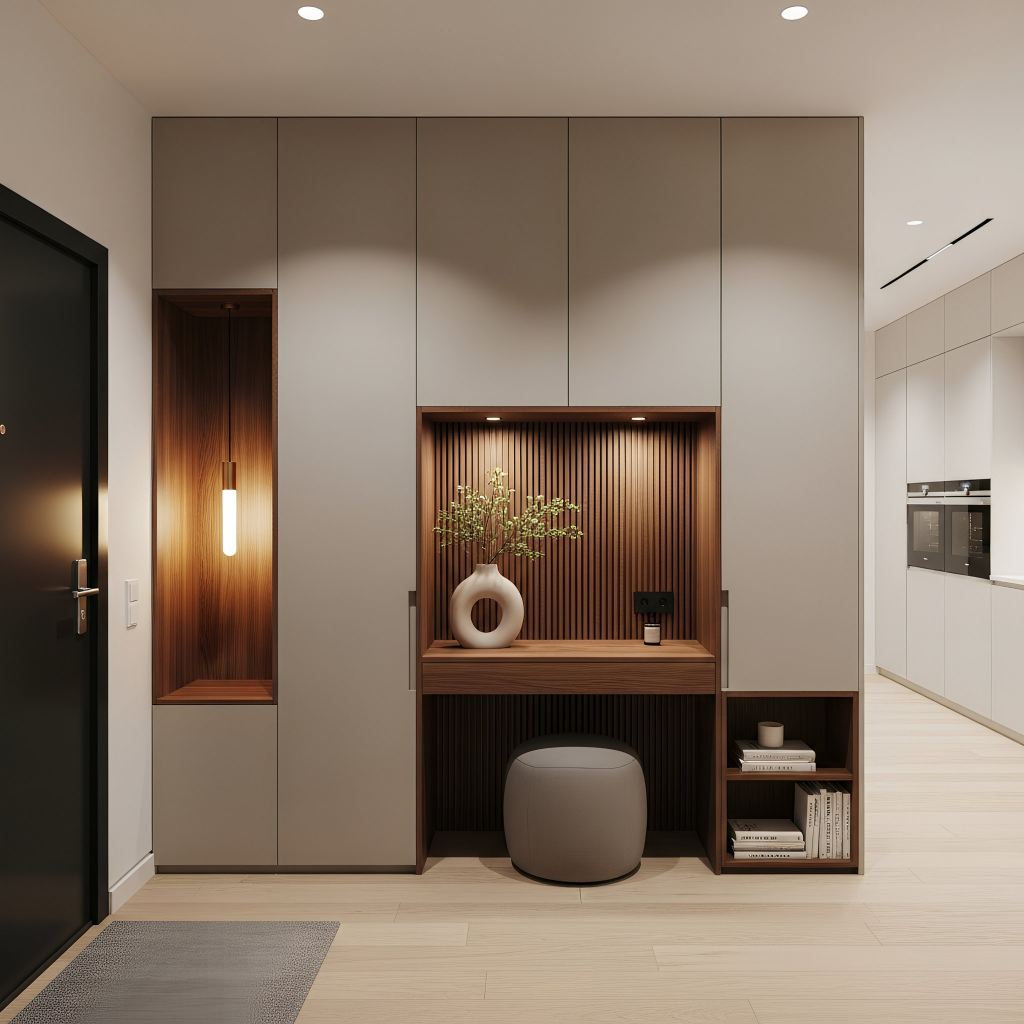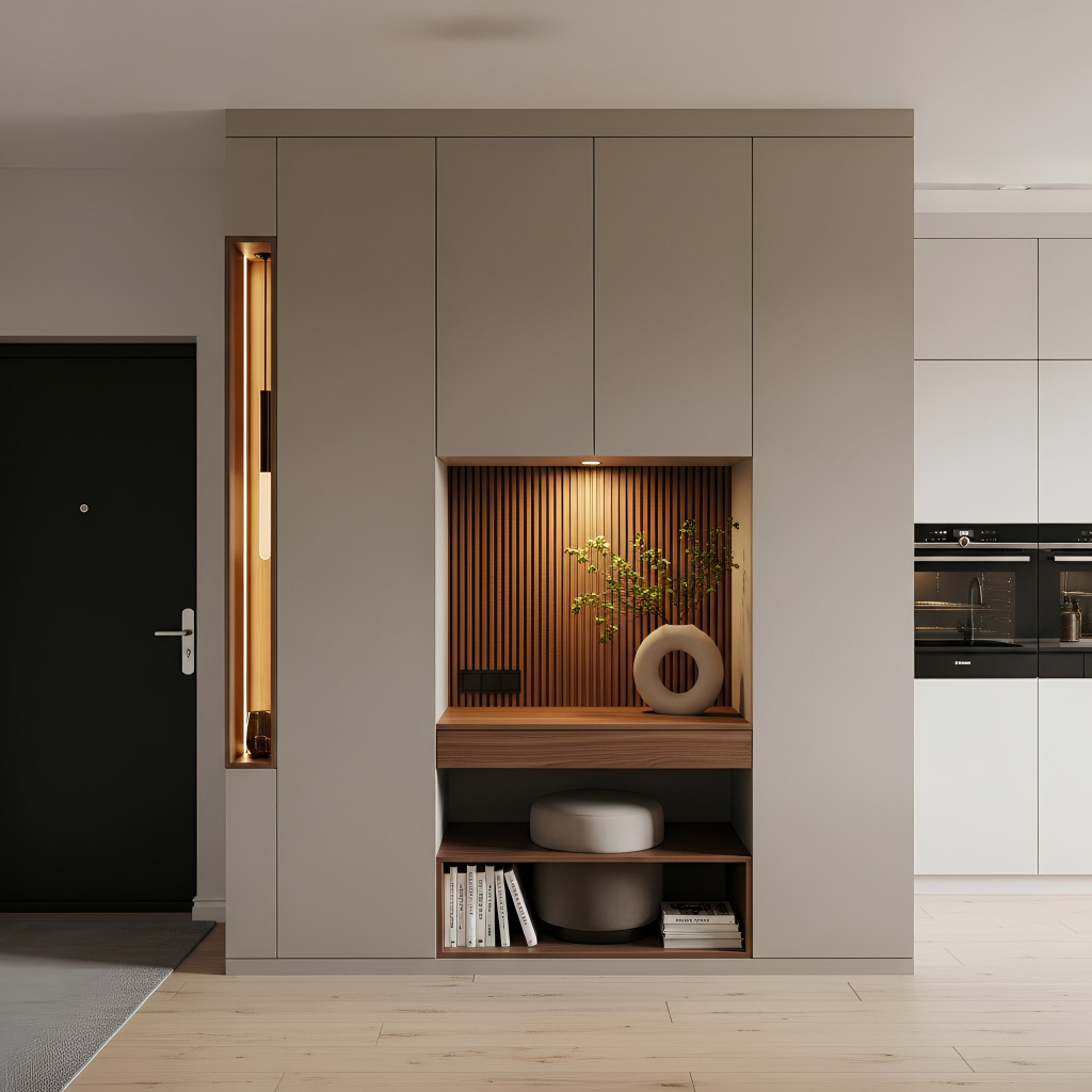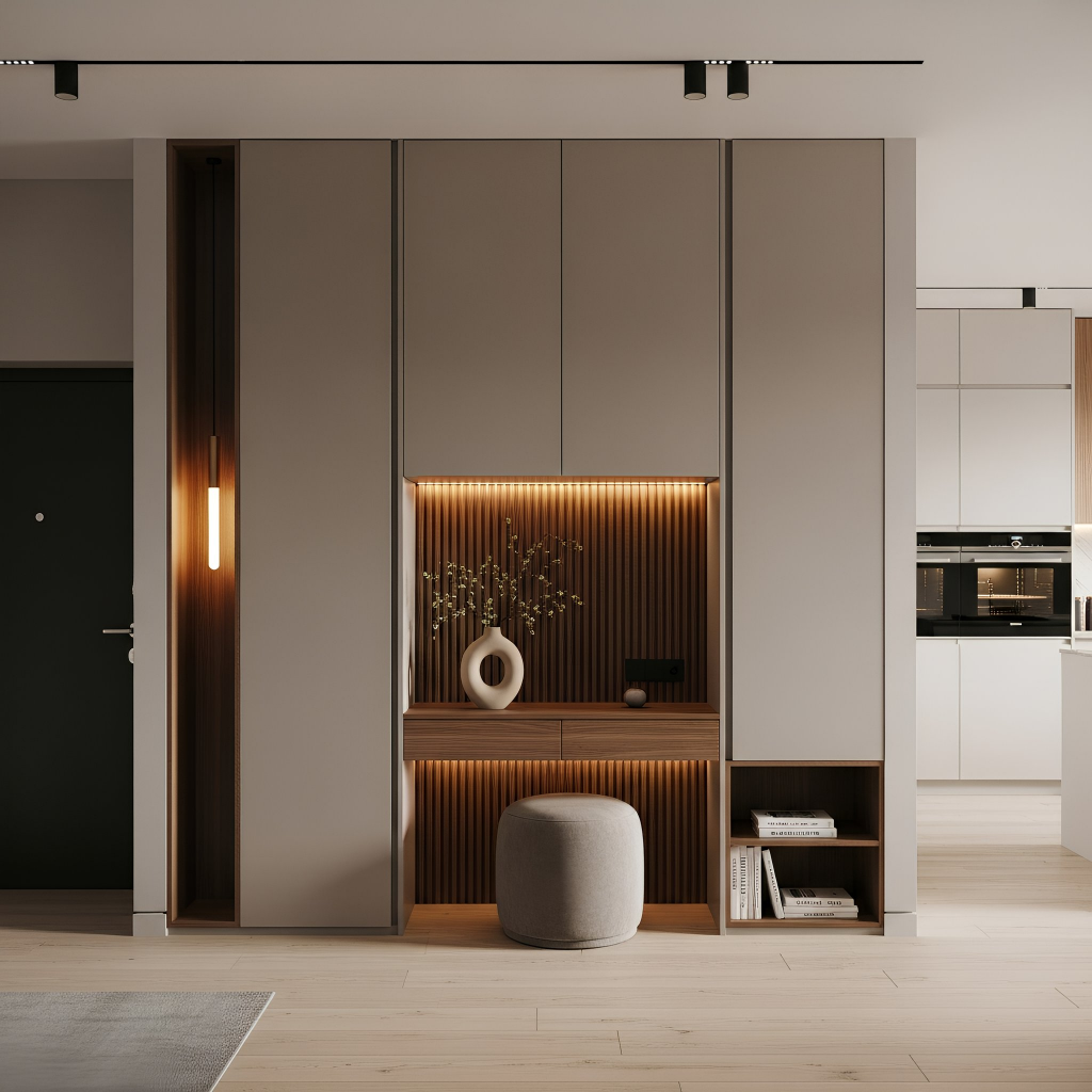 Продуманная современная композиция с акцентом на уют и практичность: гладкие фасады создают спокойную, почти монолитную плоскость, а центральная ниша с вертикальными рейками и подсветкой превращается в компактную зону для ухода за собой или быстрых сборов. Встроенная боковая ниша с подвесным светильником добавляет глубины и делает модель более атмосферной. Конструкция выглядит цельной, аккуратной и интерьерно зрелой — это тот случай, когда функциональность собрана в дизайнерскую форму без единого лишнего элемента.
