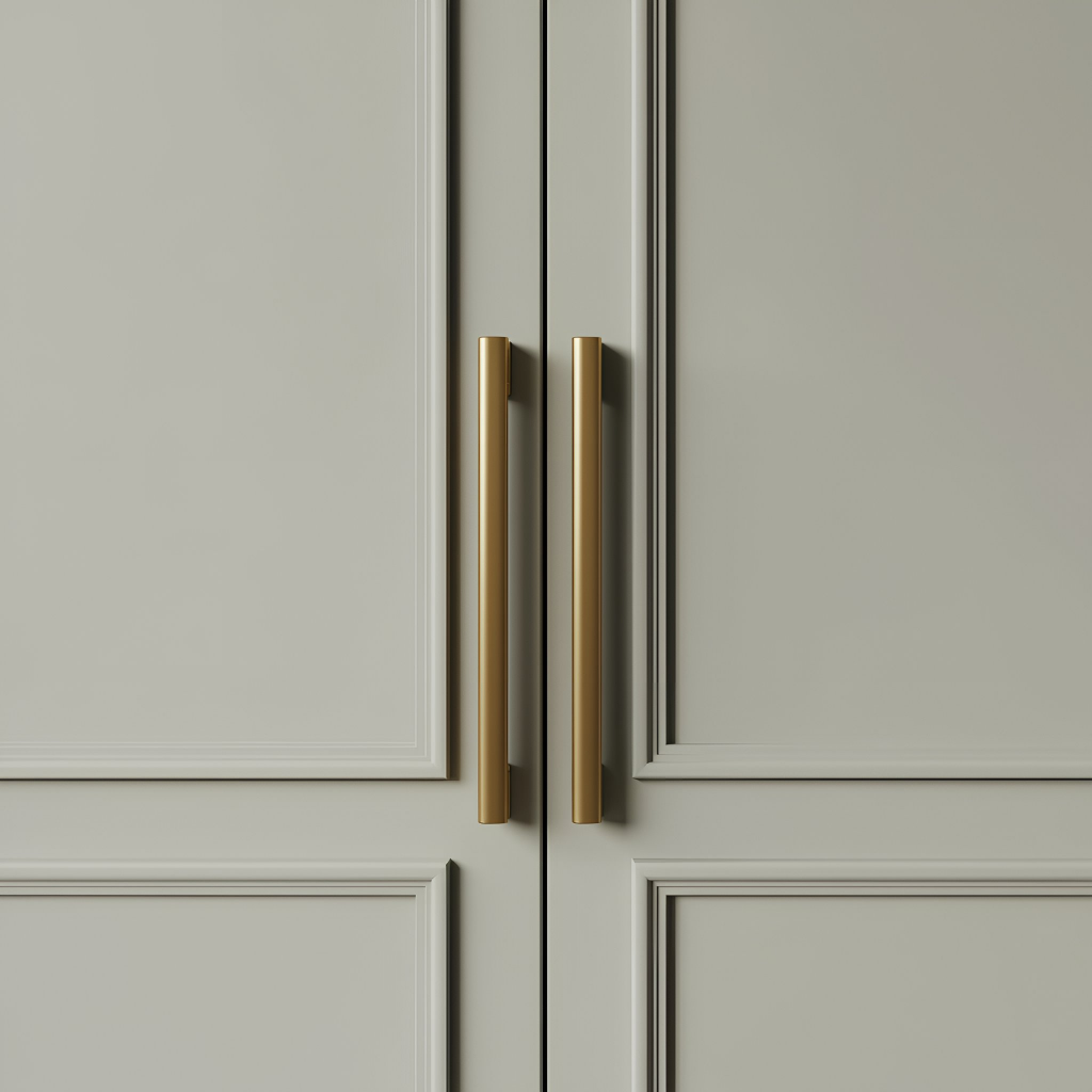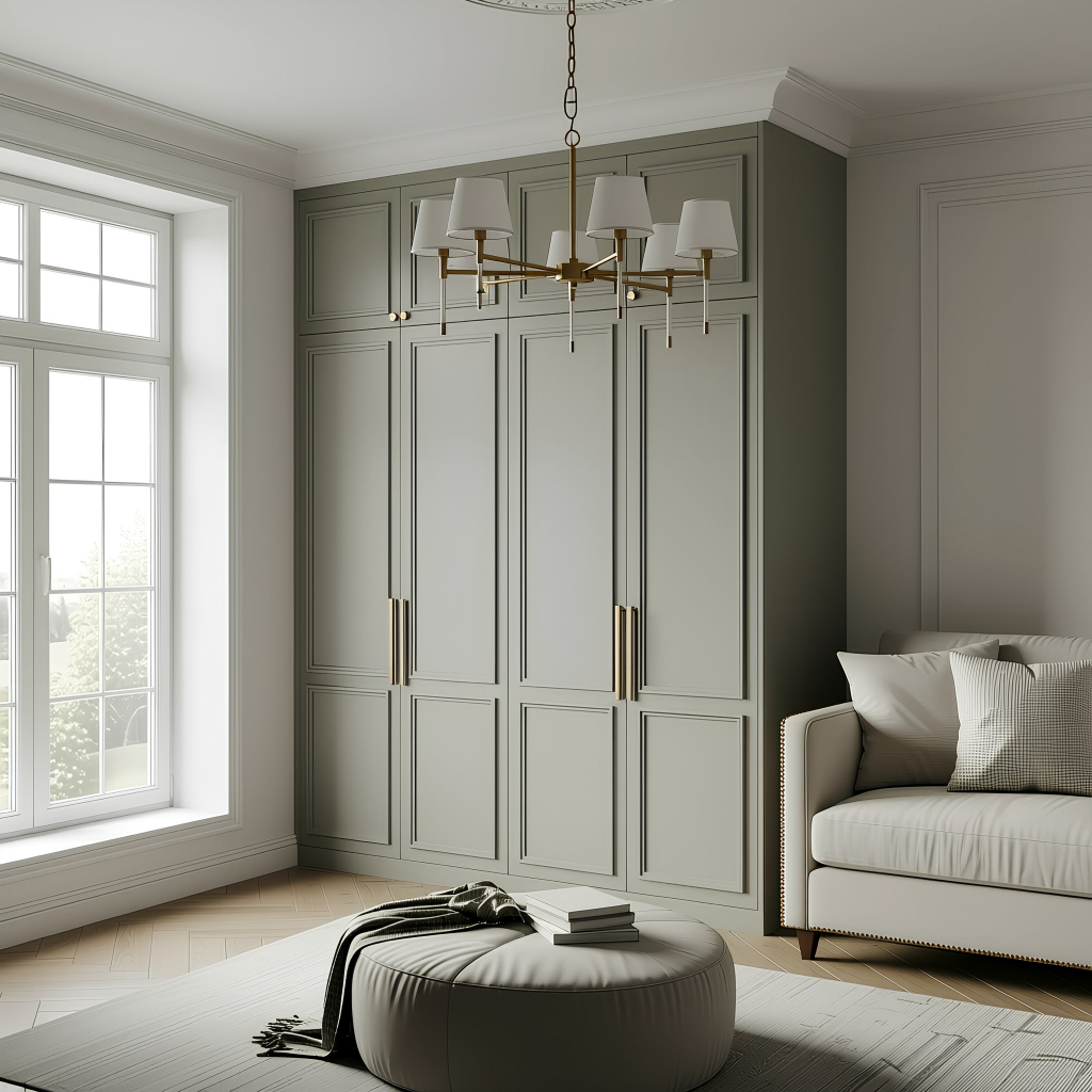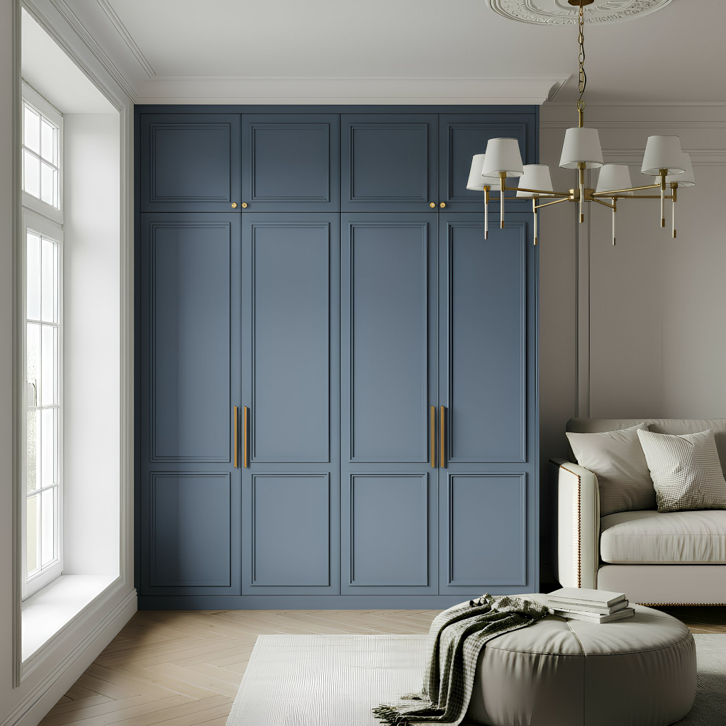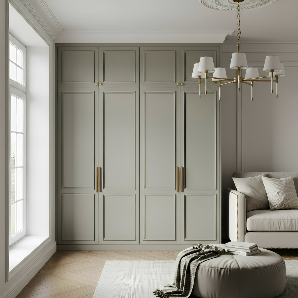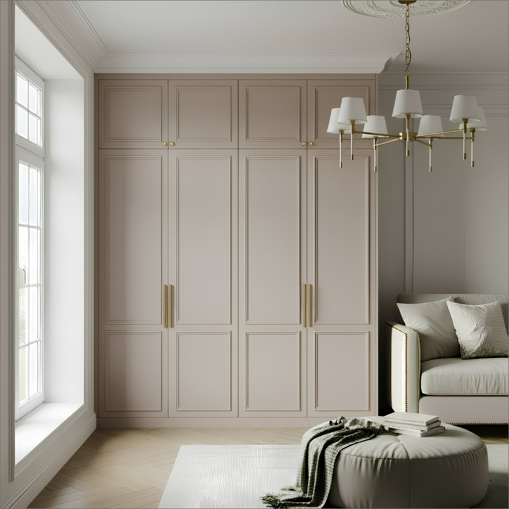 Спокойная неоклассика в своей самой чистой форме: ровные симметричные филёнки создают строгий ритм по всей высоте, а вытянутые современные ручки добавляют аккуратный контраст и делают модель более свежей и актуальной. Чёткие вертикали, продуманные пропорции и отсутствие лишних деталей формируют ощущение уверенного, зрелого дизайна — такого, который не перегружает спальню, а подчёркивает её спокойствие и архитектурную собранность.